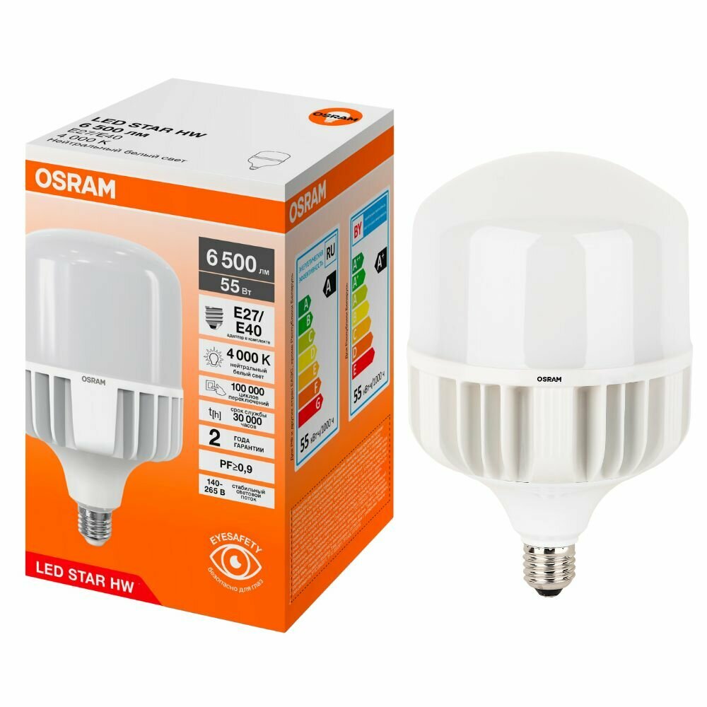 Купить Мощная лампа 55Вт OSRAM LED STAR HW, Е27 (+ цоколь Е40), 4000К нейтральный свет, 6500лм, колба Т матовая пластик