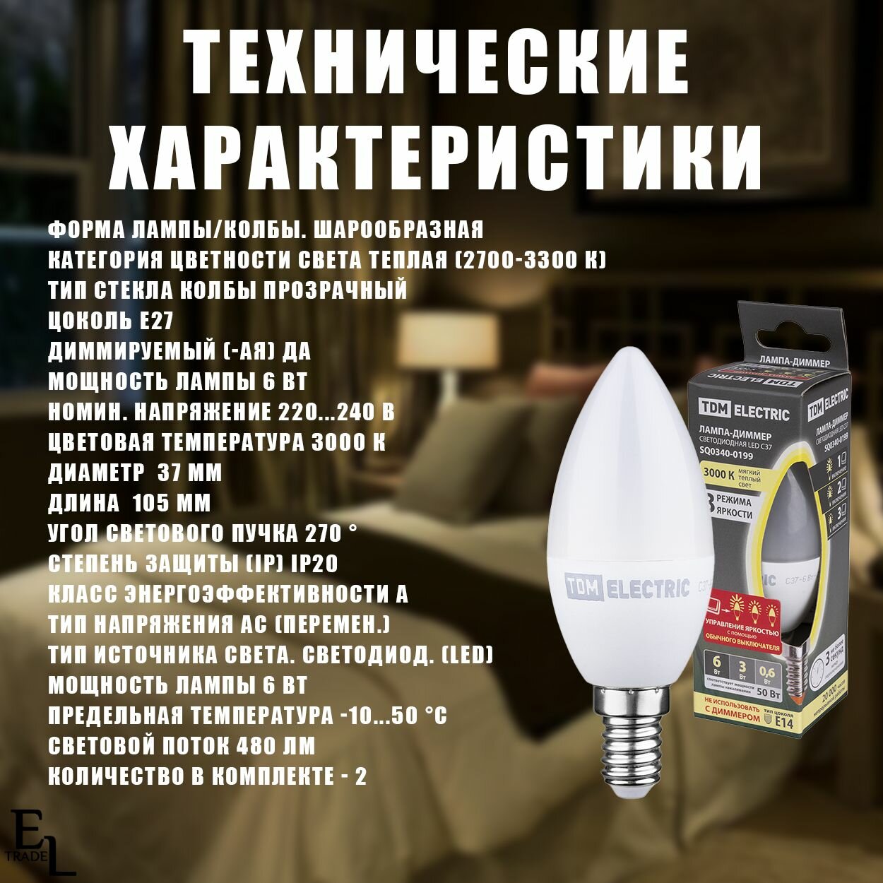 Лампа диммер светодиодная 6 Вт, 230 В, 3000 К, E14, 3 режима, TDM ELECTRIC, комплект из 2 ШТ интересное: