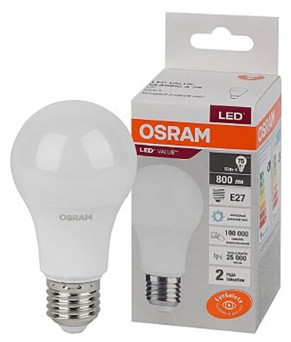 Сохранить10шт/уп. Лампа LED Груша 10Вт 220-240V E27 800Лм 6500К Угол 180 град. D-60mm L-113mm Свет Холодный белый OSRAM, уп. 10шт интересное:
