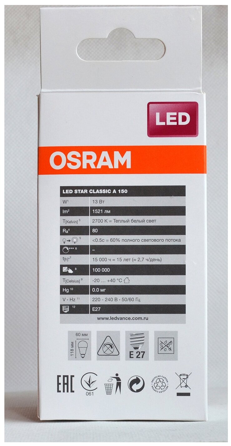 Сохранить10шт/уп. Лампа LED Груша 13Вт 220-240V E27 1521Лм 2700К Угол 200 град. D-60mm L-118mm Свет Теплый белый OSRAM, уп. 10шт интересное: