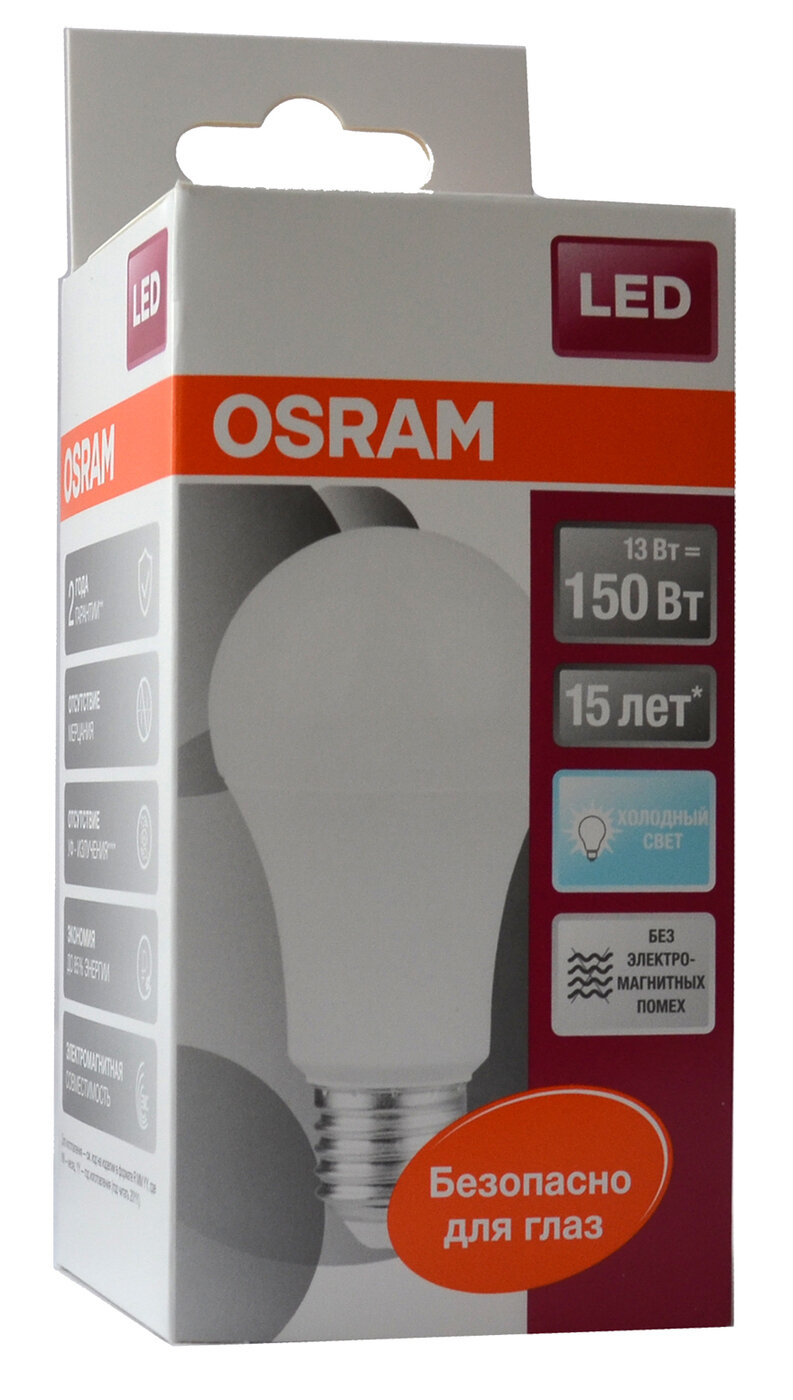 Лампочка светодиодная LED OSRAM "Груша" E27 15Вт 6500К, Холодный белый (набор 10 штук)