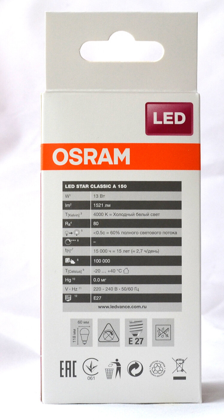 Сохранить5шт/уп. Лампа LED Груша 13Вт 220-240В E27 1521Лм 4000К Угол 200 град. d 60mm h 118mm Свет Дневной белый Osram, уп. 5шт интересное: