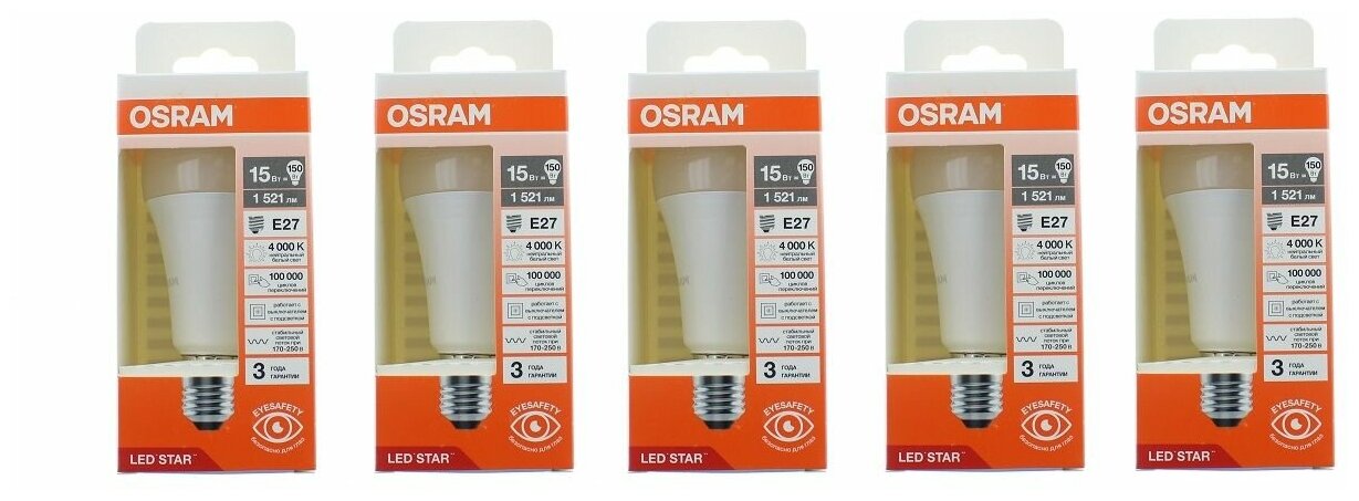 Ниже Вы можете прочитать отзывы на Лампочка светодиодная LED OSRAM "Груша" E27 15Вт 4000К, Нейтральный белый (набор 5 штук), ознакомится с подробными характеристиками, посмотреть интересные обзоры и фотографии на Лампочка светодиодная LED OSRAM "Груша" E27 15Вт 4000К, Нейтральный белый (набор 5 штук).