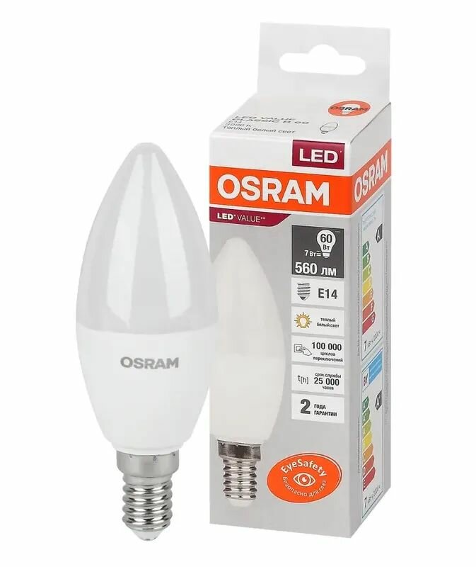 Купить 4шт/уп. Лампа LED Свечка 6.5Вт 220-240В E14 560Лм 3000К Угол 200 град. d 38mm h 106mm Свет Теплый белый Osram, уп. 4шт