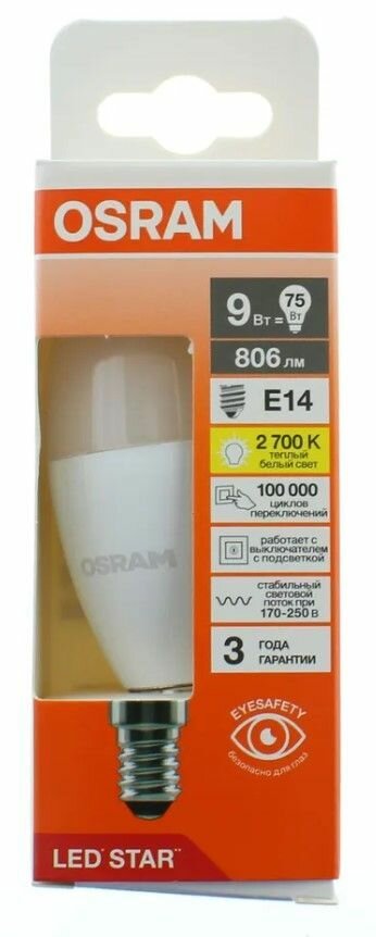 Купить 5шт/уп. Лампа LED Свечка 9Вт 170-250В E14 806Лм 2700К Угол 200 град. d 37mm h 110mm Свет Теплый белый Osram, уп. 5шт