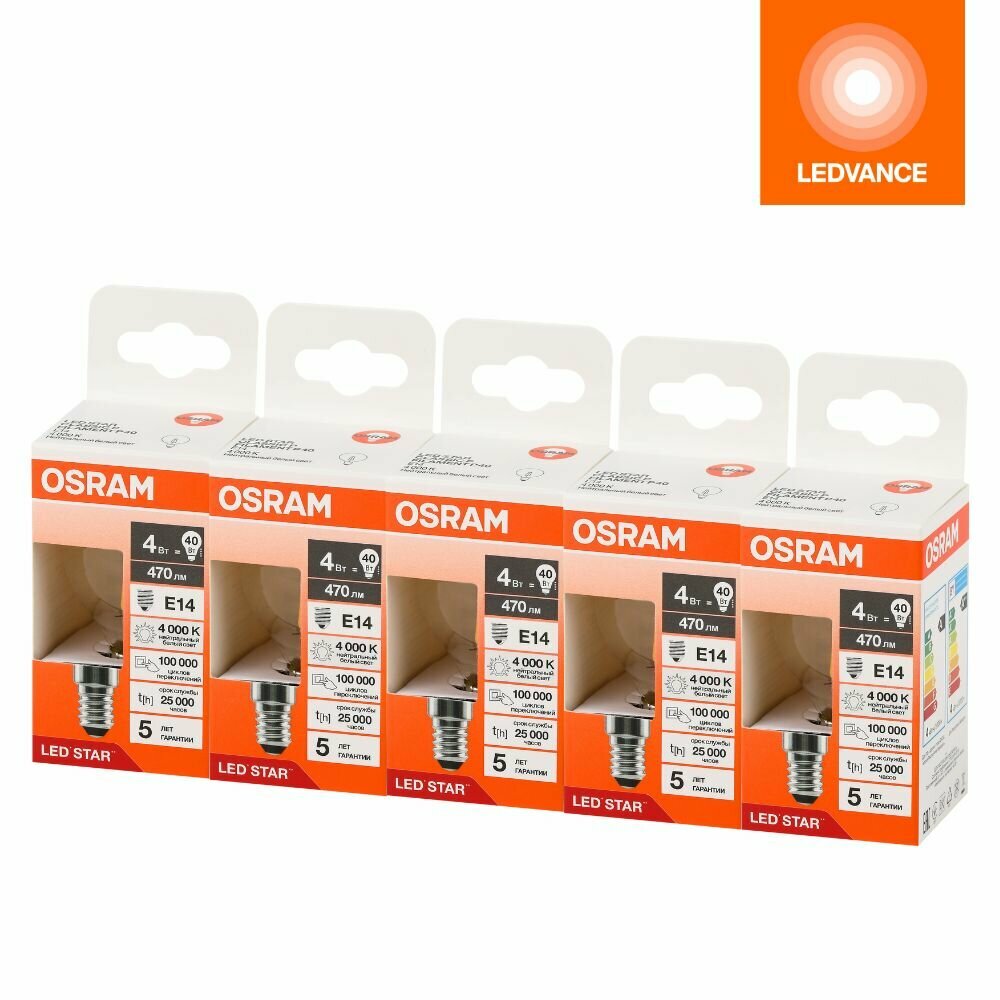 Купить Лампочки светодиодные филаментные OSRAM LED STAR, 4Вт, 5 шт в наборе, Е14, 4000К нейтральный белый свет, 470лм, колба Р шар прозрачная стекло