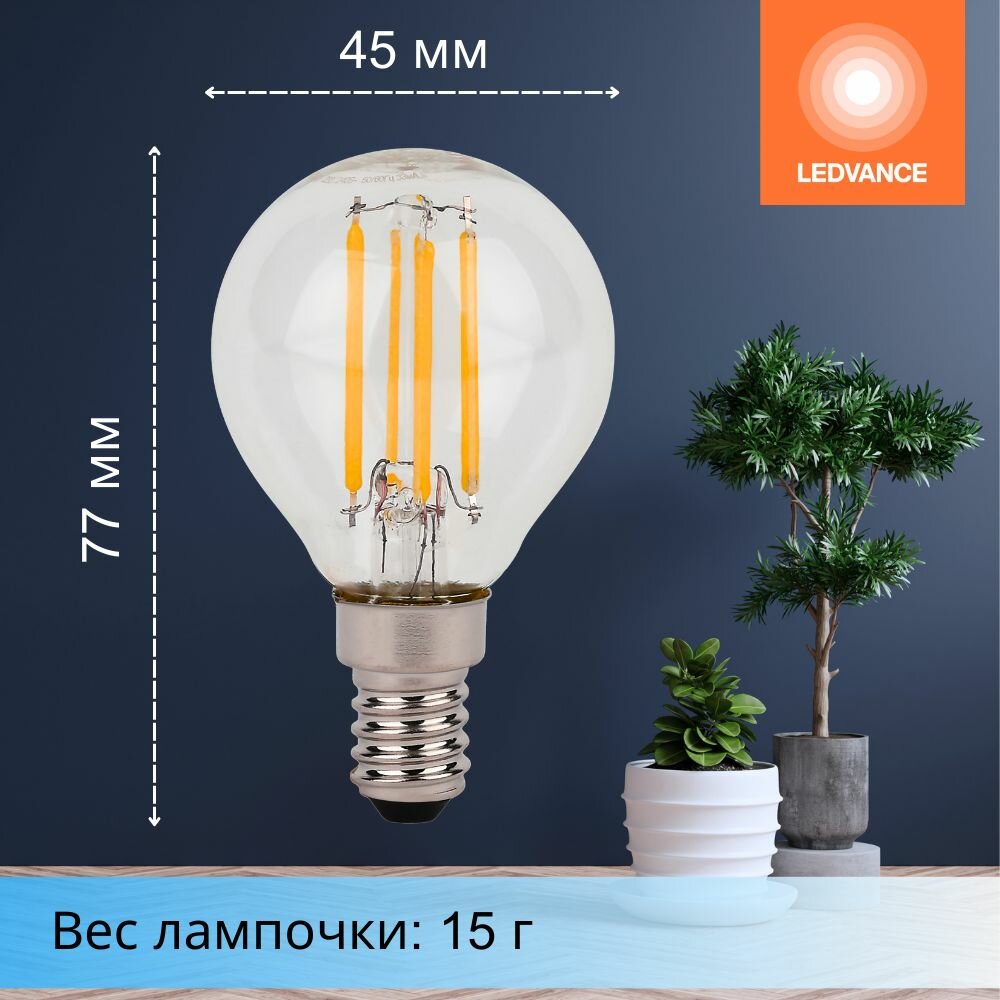 Лампочки светодиодные филаментные OSRAM LED STAR, 4Вт, 5 шт в наборе, Е14, 2700К теплый белый свет, 470лм, колба Р шар прозрачная стекло