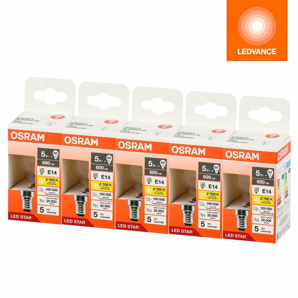 Лампочки светодиодные филаментные OSRAM LED STAR, 6Вт, 5 шт в наборе, Е14, 2700К теплый белый свет, 806лм, колба шар прозрачная стекло
