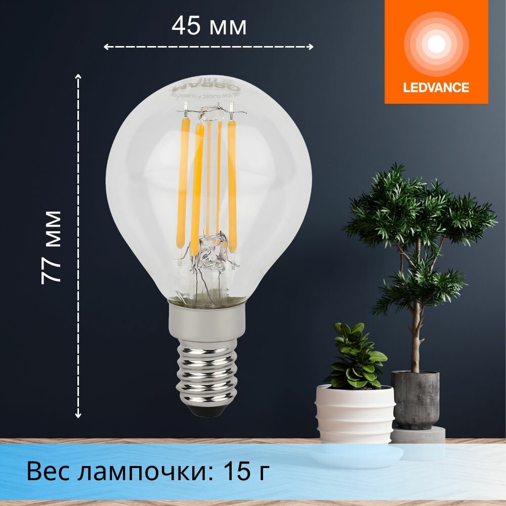 Лампочки светодиодные филаментные OSRAM LED STAR, 4Вт, 5 шт в наборе, Е14, 4000К нейтральный белый свет, 470лм, колба Р шар прозрачная стекло