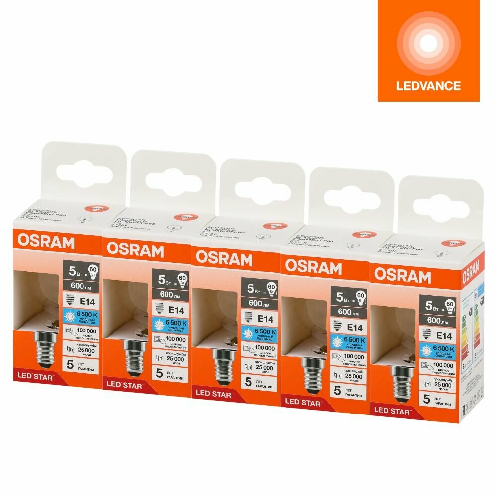 Лампочки светодиодные филаментные OSRAM LED STAR, 6Вт, 5 шт в наборе, Е14, 6500К холодный белый свет, 806лм, колба Р шар прозрачная стекло