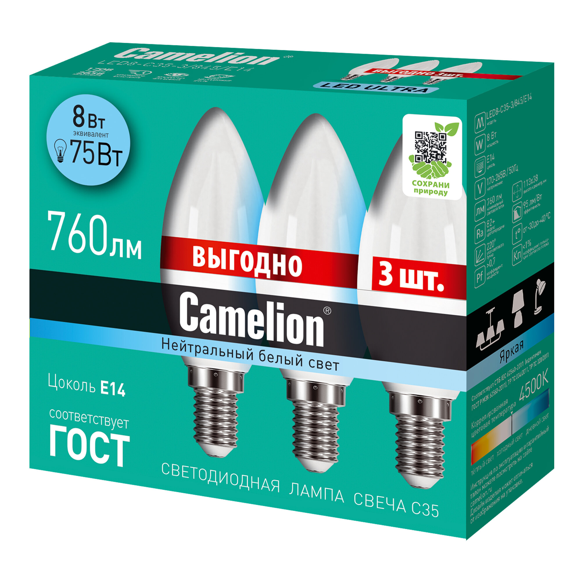 Лампочка светодиодная Camelion LED8 845 E14 промо 3 штук в упаковке интересное: