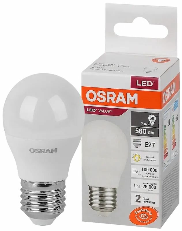 Купить 2шт/уп. Лампа LED Шарик 7Вт 220-240В E27 560Лм 3000К Угол 180 град. d 47mm h 88mm Свет Теплый белый Osram, уп. 2шт