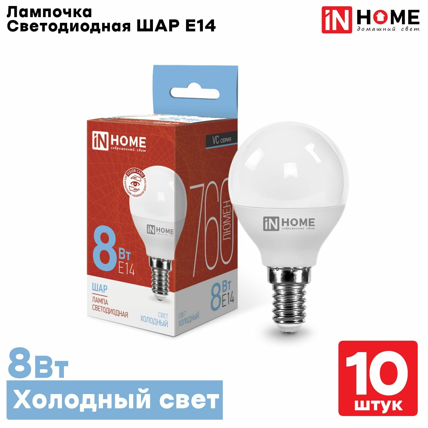 Купить Лампа светодиодная IN HOME LED-ШАР-VC 8Вт Е14 6500К 760Лм, Холодный белый свет, 10шт.