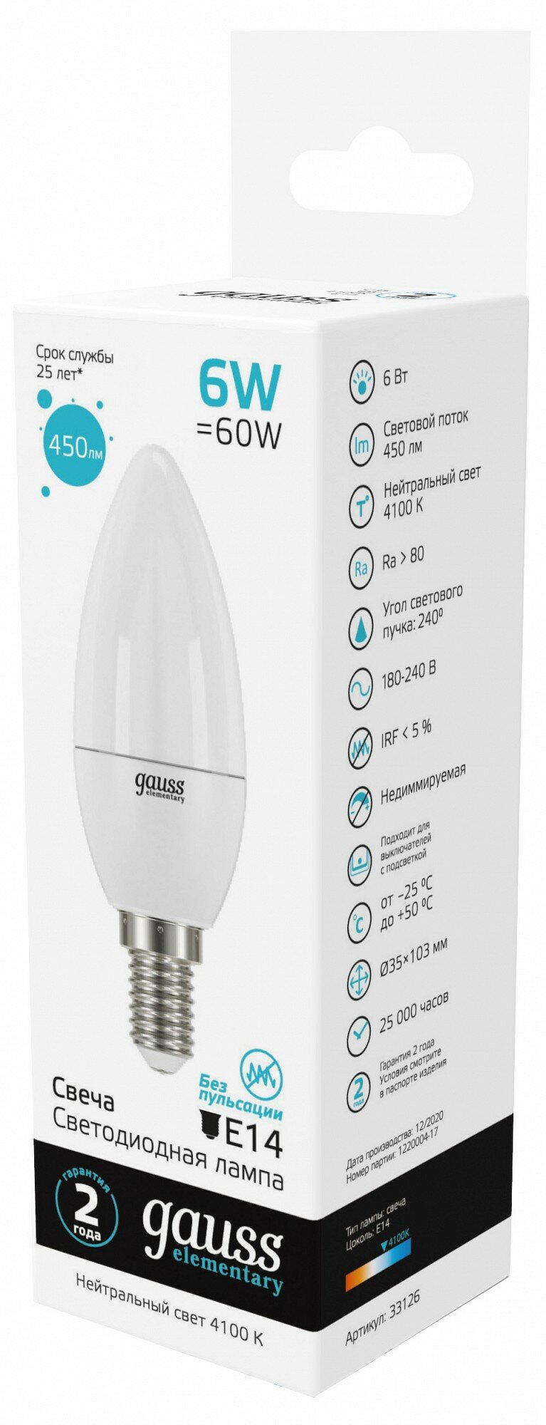 Лампа светодиодная Elementary 6Вт свеча 4100К нейтр. бел. E14 450лм GAUSS 33126(2 штук.) интересное: