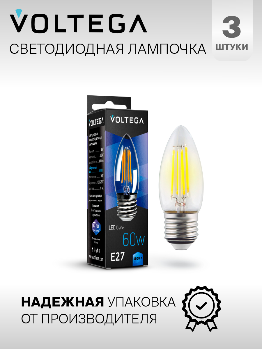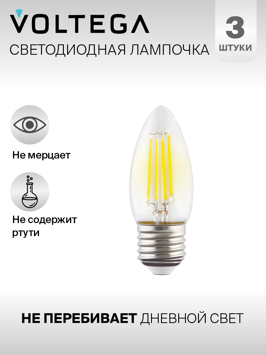 Купить Лампочка светодиодная E27 форма свеча 6W теплый свет Voltega Crystal Candle 4000K упаковка 3 штуки
