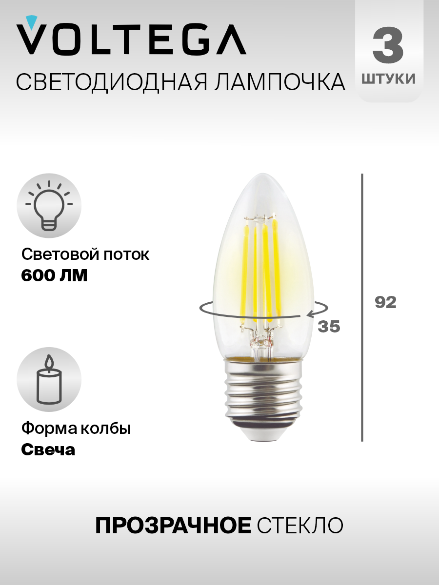 СохранитьЛампочка светодиодная E27 форма свеча 6W теплый свет Voltega Crystal Candle 4000K упаковка 3 штуки интересное: