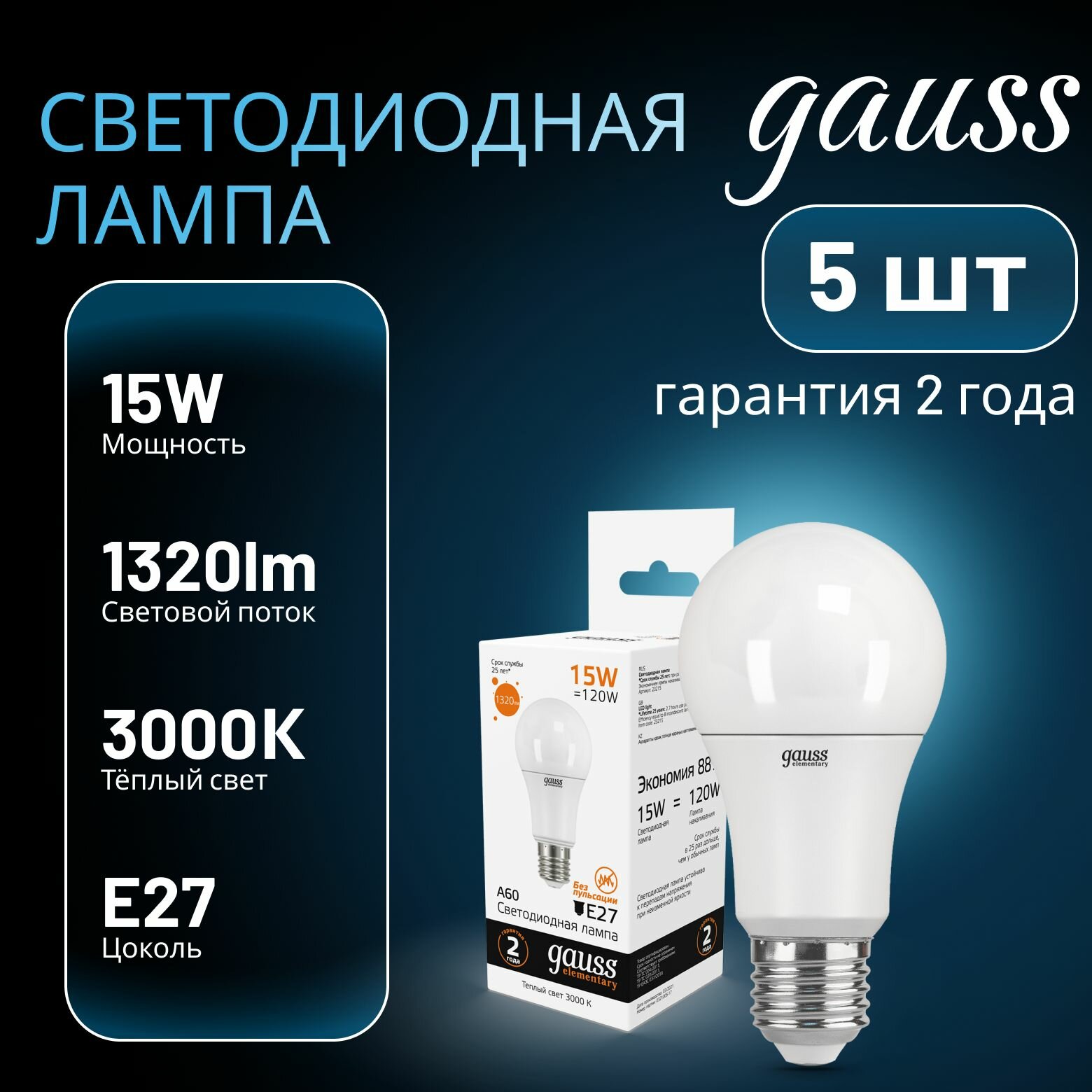 Купить Лампа светодиодная Elementary 15Вт A60 грушевидная 3000К тепл. бел. E27 1320лм GAUSS 5шт