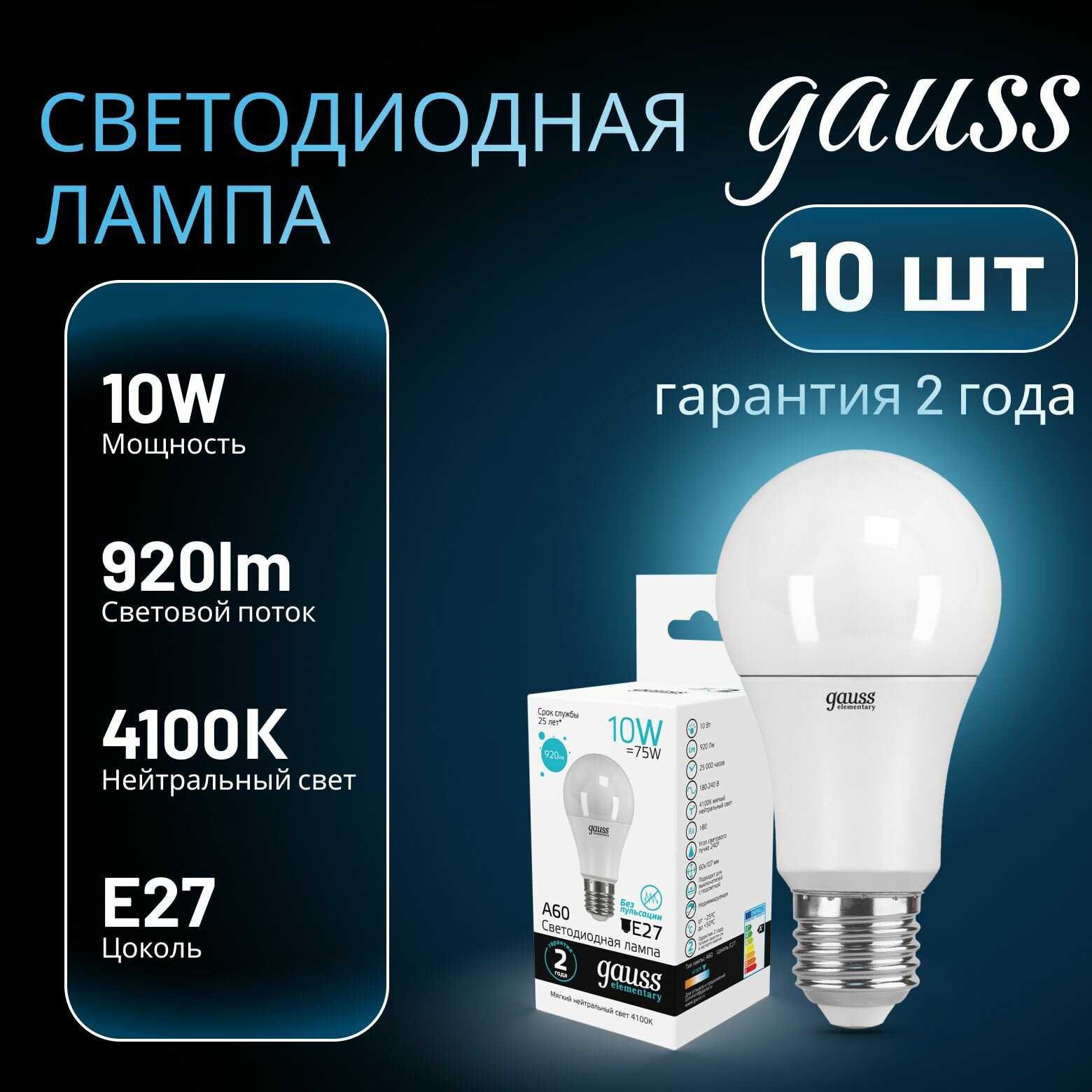 Купить Лампа светодиодная Elementary 10Вт A60 грушевидная 4100К нейтр. бел. E27 920лм GAUSS 10шт