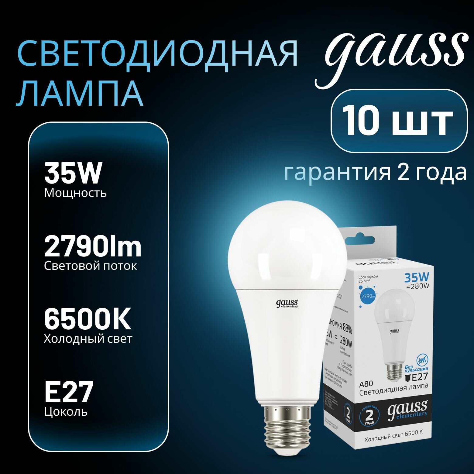Купить Лампа светодиодная Elementary 35Вт A80 грушевидная 6500К холод. бел. E27 2790лм GAUSS 10шт