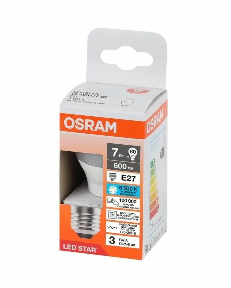 Сохранить1шт/уп. Лампа LED Шарик 7Вт 170-250В E27 600Лм 6500К Угол 180 град. d 45mm h 79mm Свет Холодный белый Osram, уп. 1шт интересное: