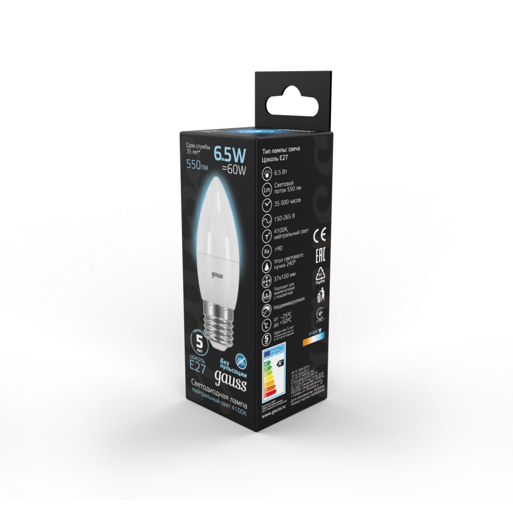 Лампа светодиодная Black 6.5Вт свеча 4100К нейтр. бел. E27 550лм GAUSS 103102207(5 штук.)