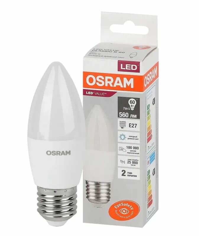Сохранить4шт/уп. Лампа LED Свечка 7Вт 220-240В E27 560Лм 6500К Угол 200 град. d 38mm h 105mm Свет Холодный белый Osram, уп. 4шт интересное: