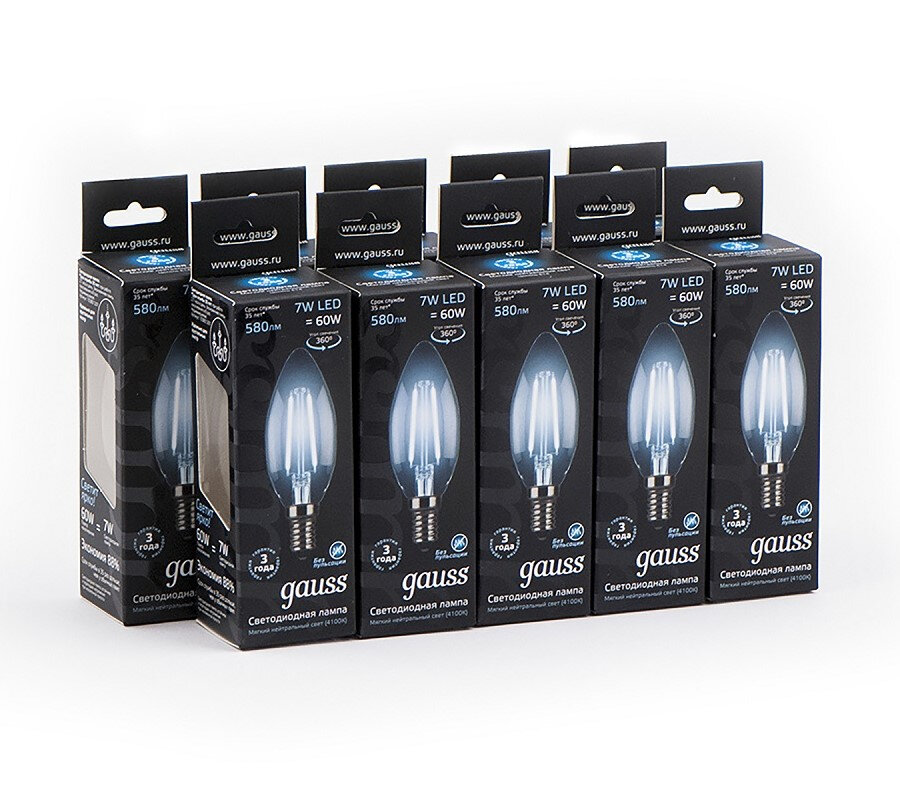 Лампа светодиодная филаментная Filament 7Вт свеча 4100К нейтр. бел. E14 580лм GAUSS 103801207(3 штук.) интересное: