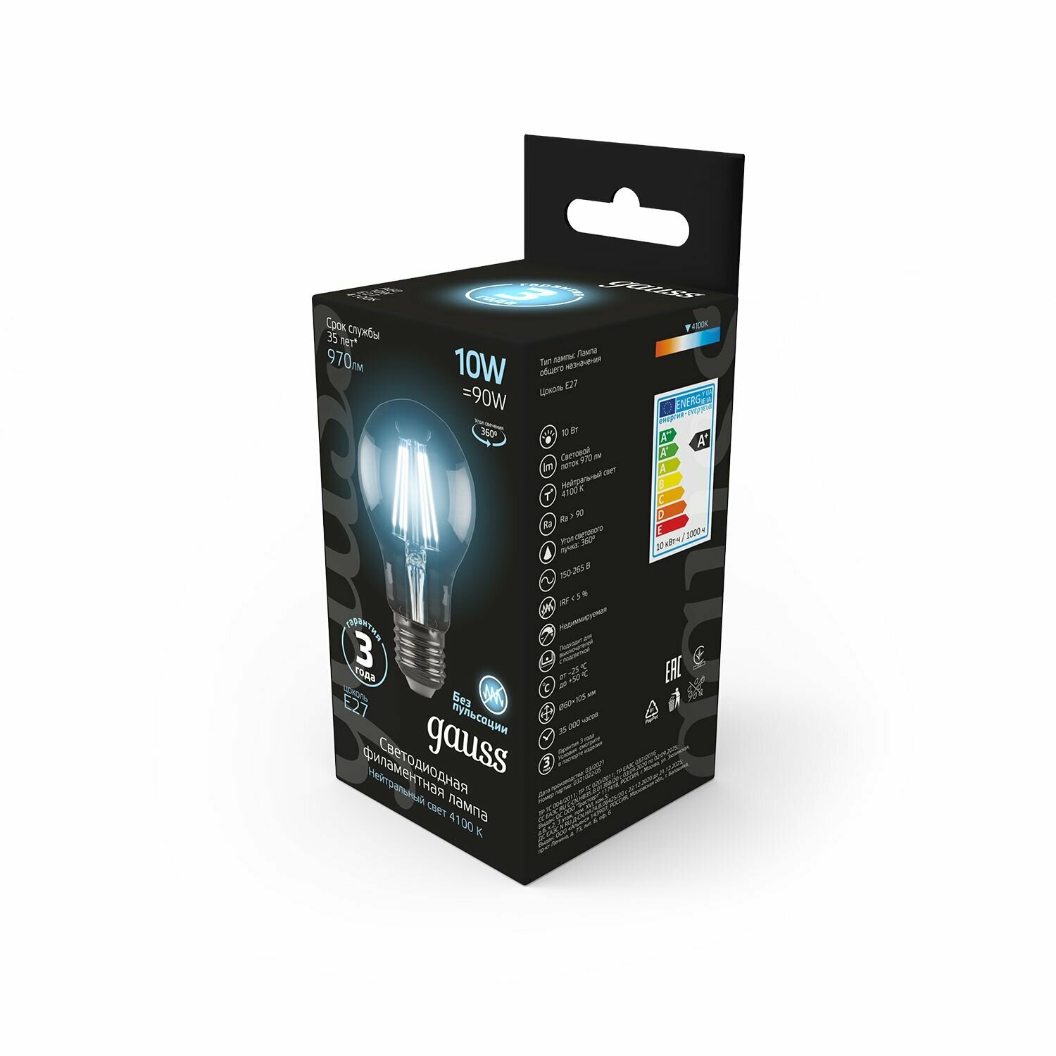 Лампа светодиодная филаментная Filament 10Вт A60 4100К нейтр. бел. E27 970лм GAUSS 102802210(3 штук.) интересное:
