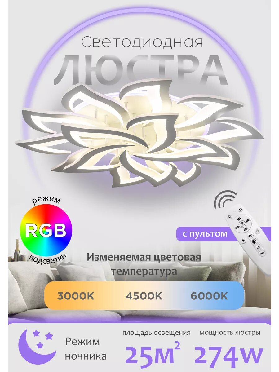 Люстра потолочная светодиодная YA2410-9 WH ночник с пультом для низких потолков