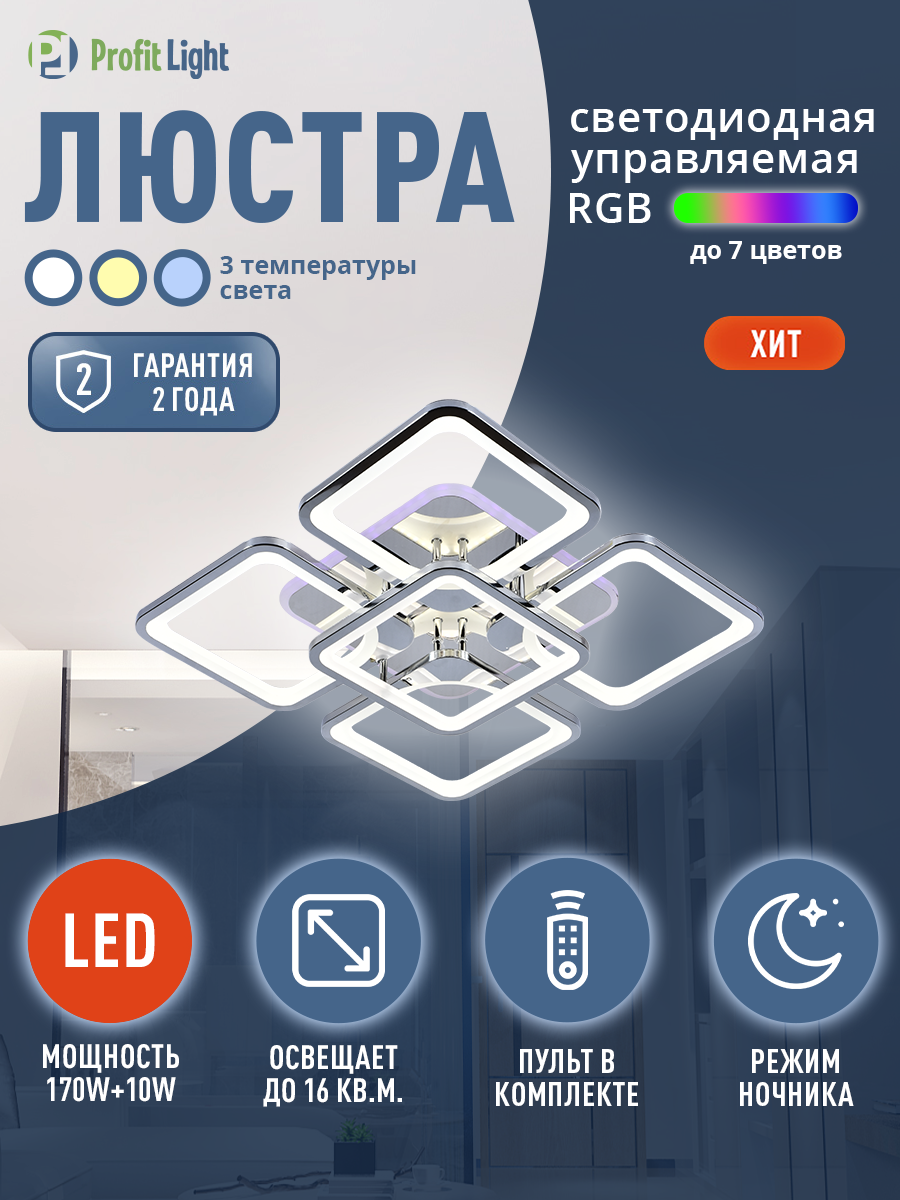 Ниже Вы можете прочитать отзывы на Люстра потолочная светодиодная с пультом Profit Light 8057/4+1 CHR 170W+10W RGB, ознакомится с подробными характеристиками, посмотреть интересные обзоры и фотографии на Люстра потолочная светодиодная с пультом Profit Light 8057/4+1 CHR 170W+10W RGB.