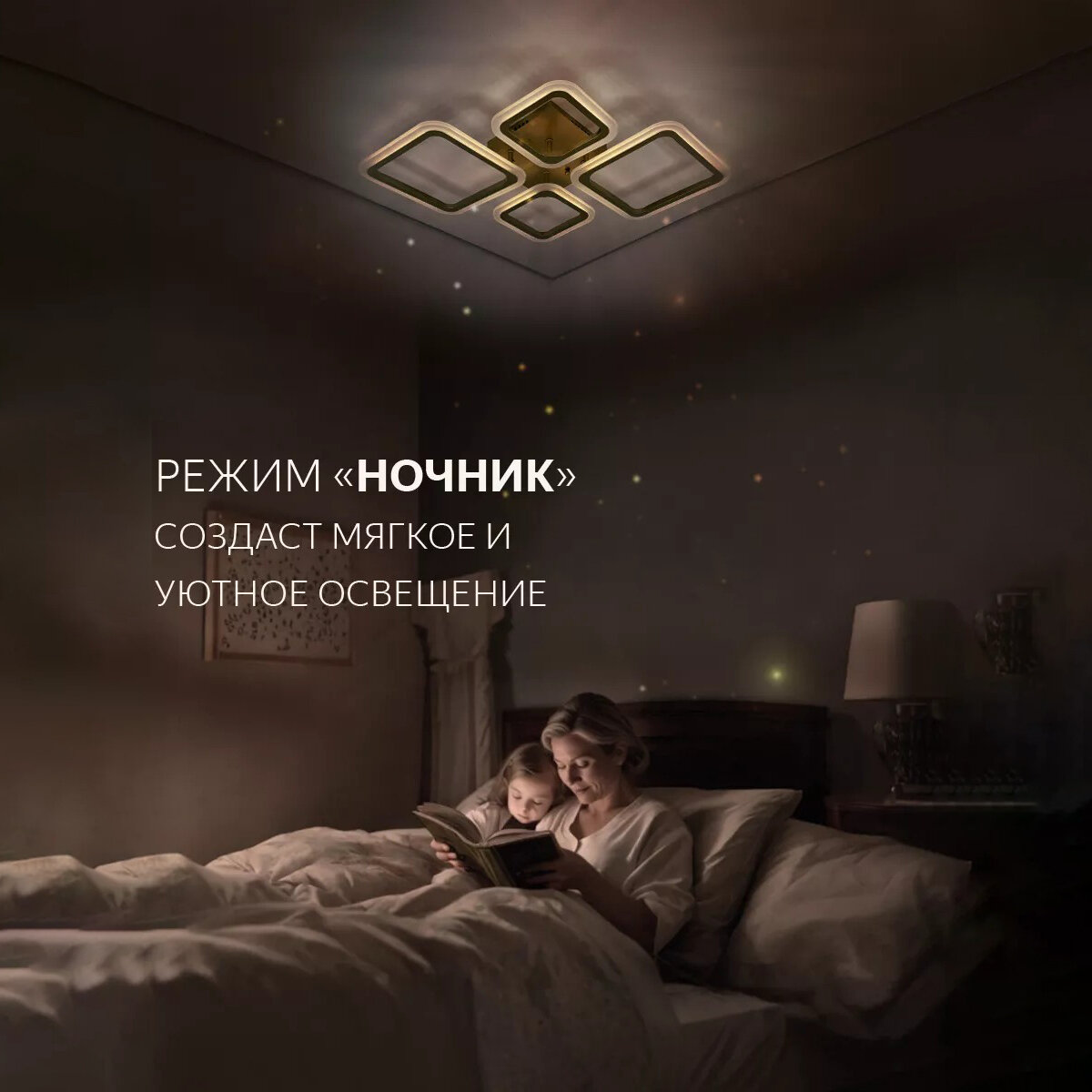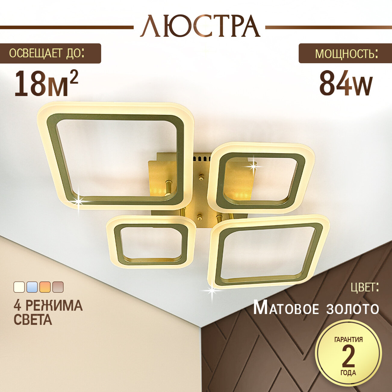 Люстра потолочная светодиодная с пультом и диммером 84W, золотая, квадраты