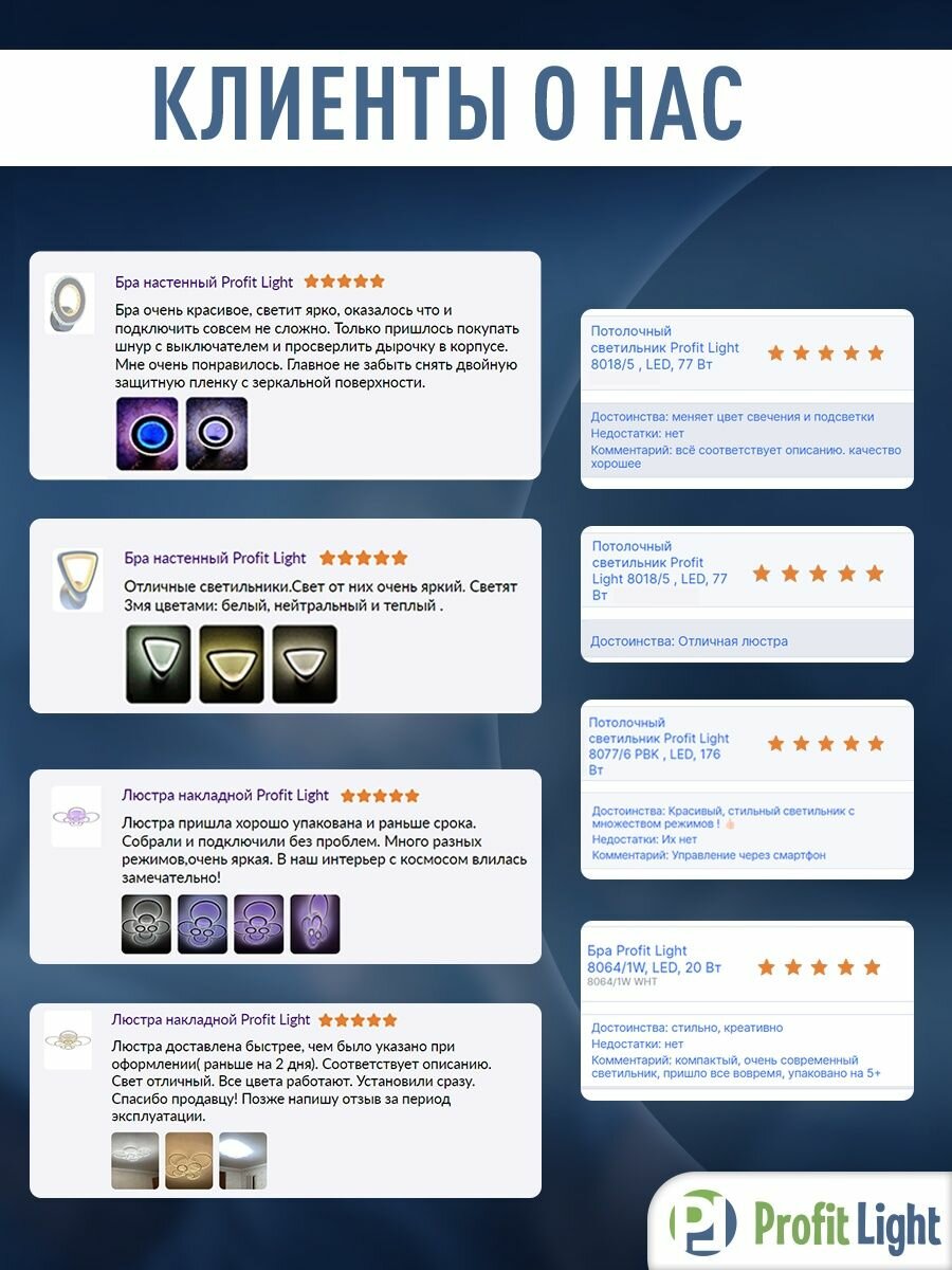 Ниже Вы можете прочитать отзывы на Люстра потолочная светодиодная с пультом Profit Light 8075/4+4 WHT 176W+10W, ознакомится с подробными характеристиками, посмотреть интересные обзоры и фотографии на Люстра потолочная светодиодная с пультом Profit Light 8075/4+4 WHT 176W+10W.