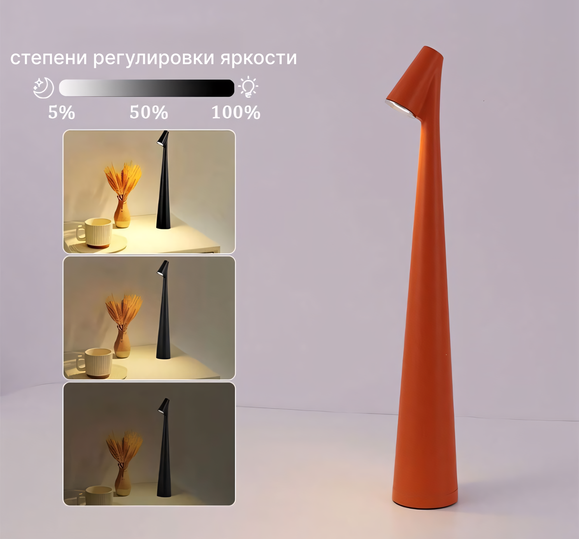 Минималистичная настольная лампа с регулировкой яркости и сенсорным управлением, оранжевый, 3 режима света, 35х5 см.