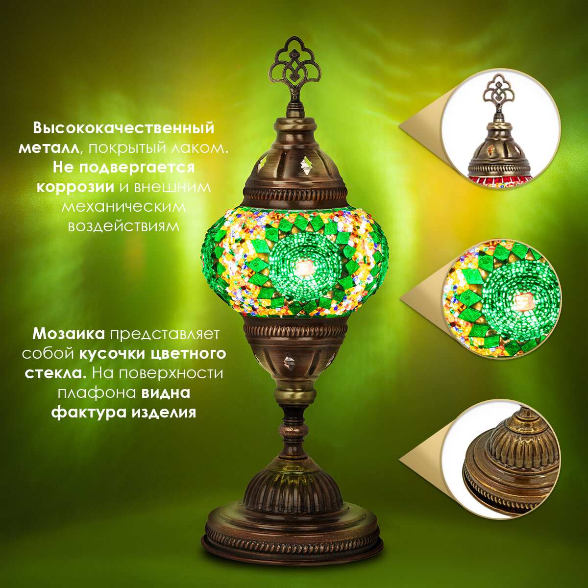 Светильник настольный с восточной мозаикой ручной работы, цвет зеленый, 11х32 см, MARMA MM-LGHT-06