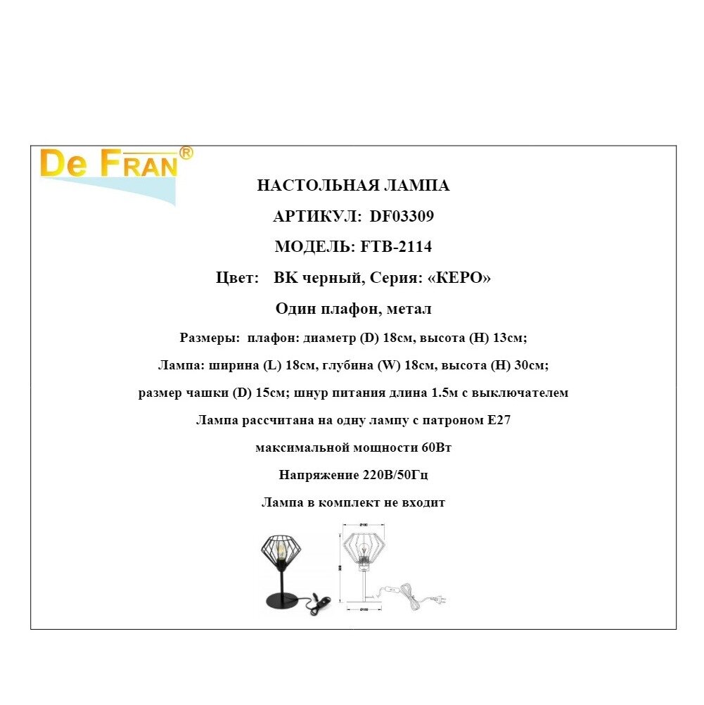 Настольная лампа De Fran FTB-2114 Е27 60 W 220V черный, серия керо интересное: