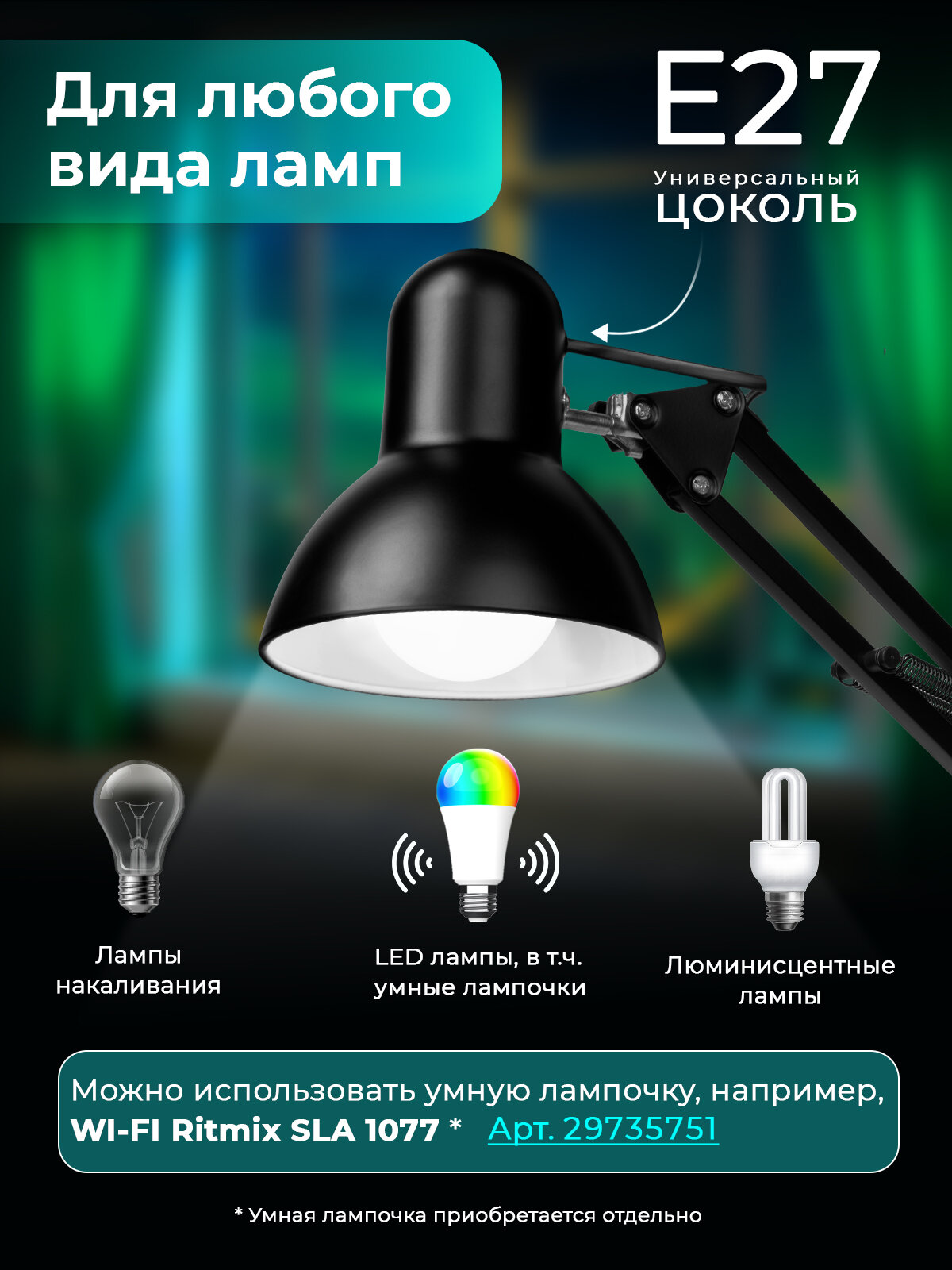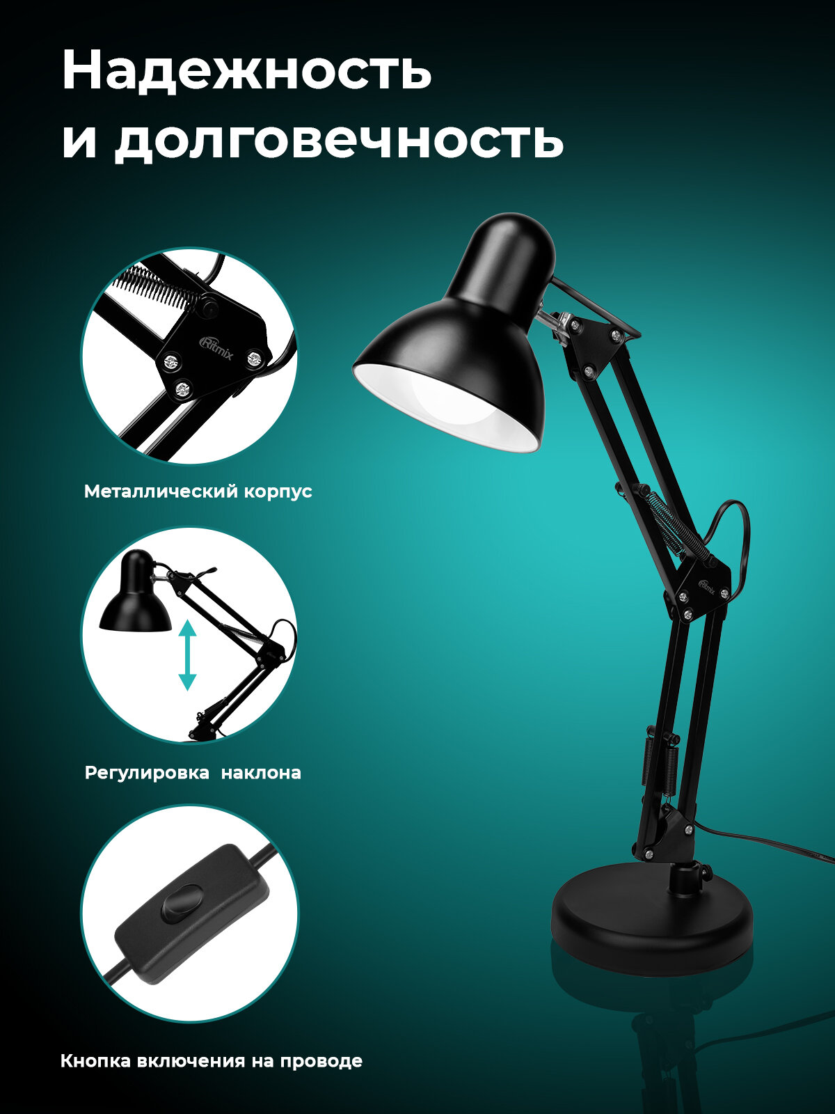 Настольная лампа Ritmix LED-745E Black , регулировка высоты, поворот на 360°, металл, цоколь E27, лампа в комплекте интересное: