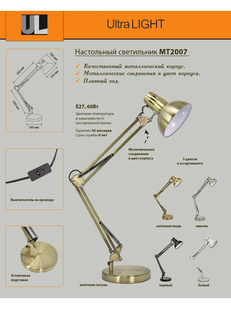 Настольная лампа светильник МТ2007 черный Ultra LIGHT 60 В ТД Трансвит интересное: