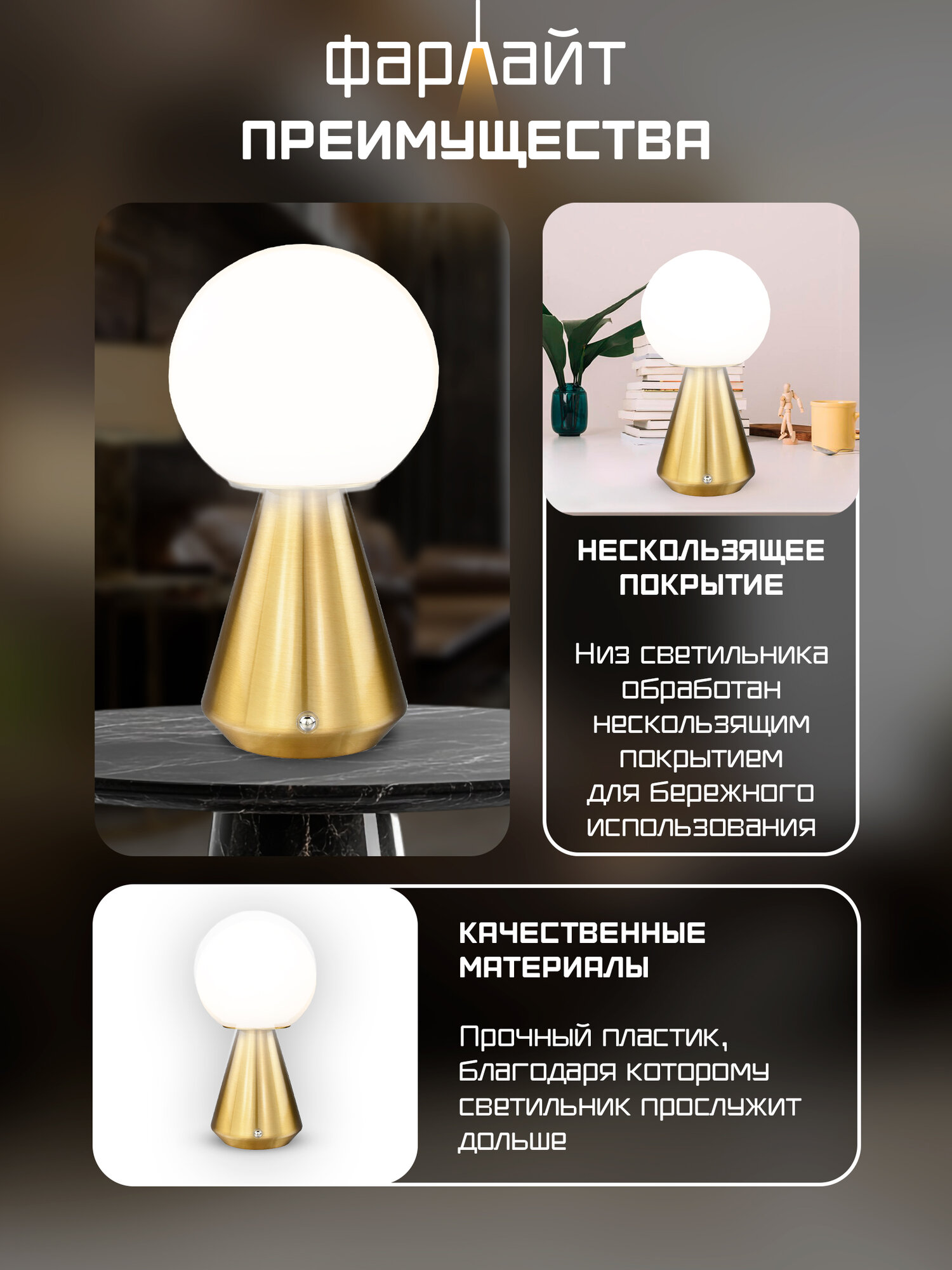 Светильник настольный "Конус", диммирумый, аккумуляторный, золотой интересное: