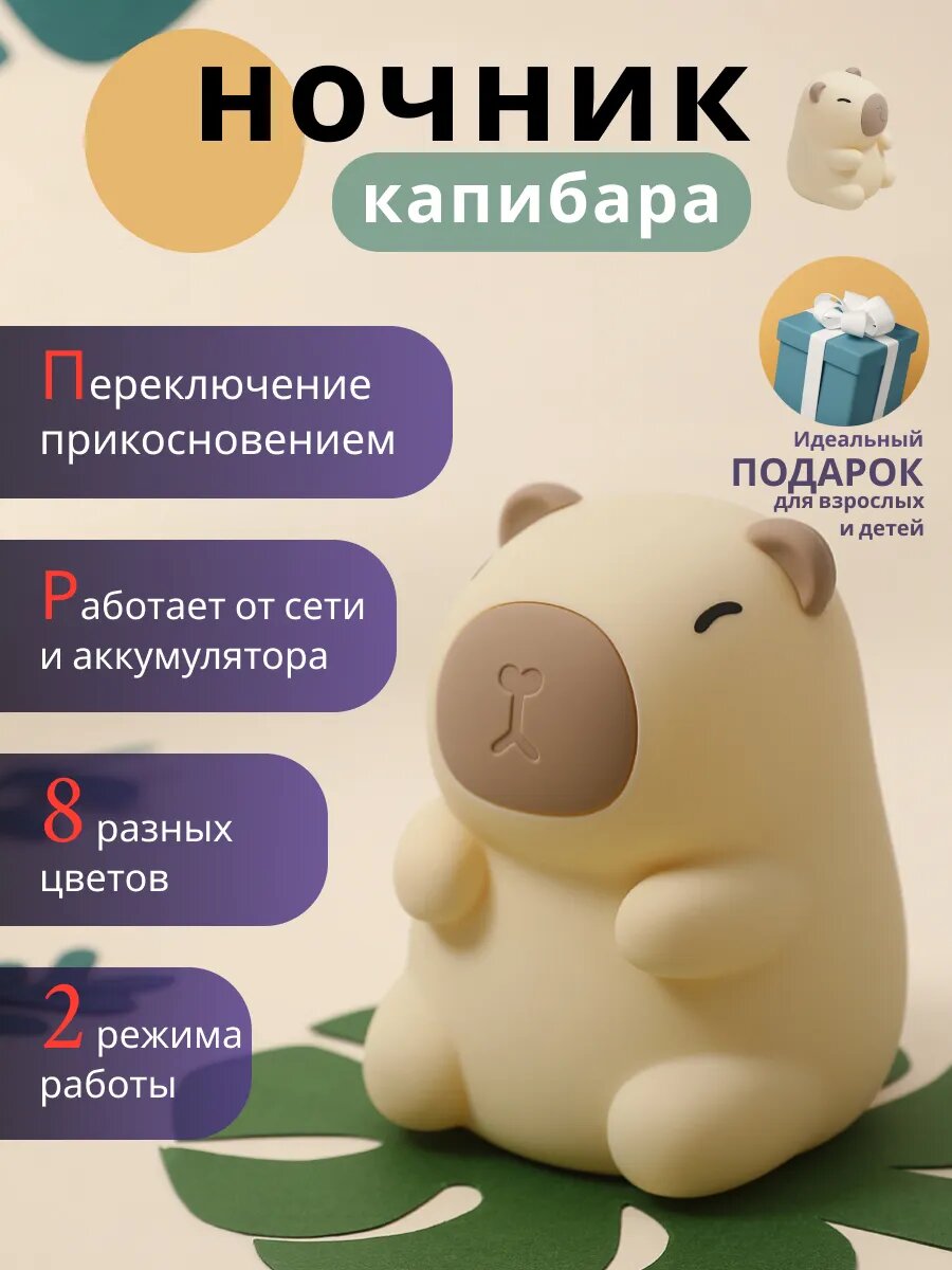 Ночник Капибара светильник силиконовый детский, беспроводной, USB-зарядка интересное: