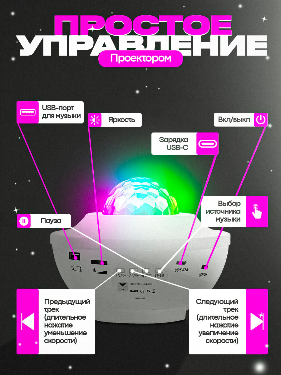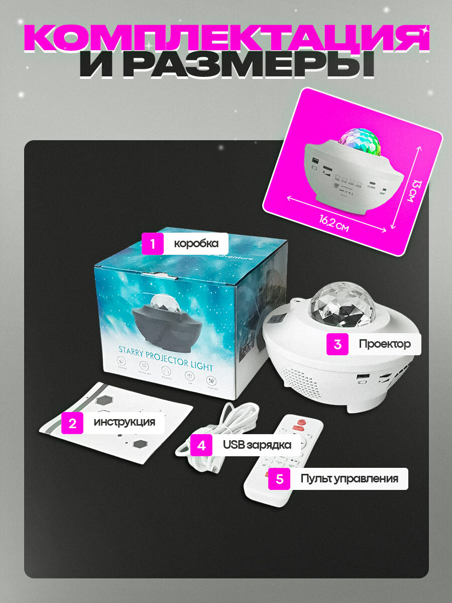 Проектор звездного неба с пультом, Bluetooth колонка и MP3 плеер, лазерный проектор, светильник ночник, белый интересное: