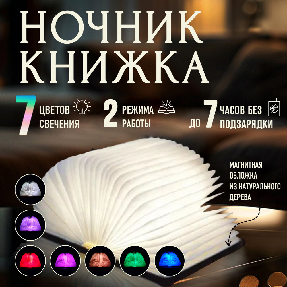 Ночник, светильник светодиодный беспроводной "Книжка", размер S (10x8 см), RGB (7 цветов свечения)
