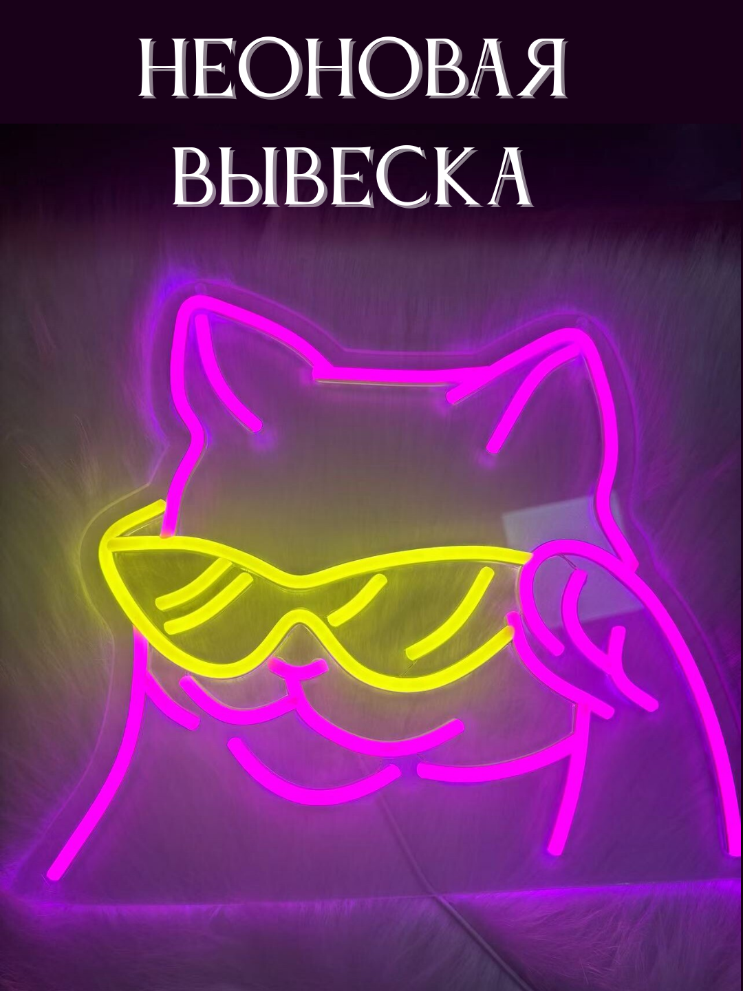 СохранитьНеоновая вывеска светильник ночник розовый кот в очках, USB разъем интересное: