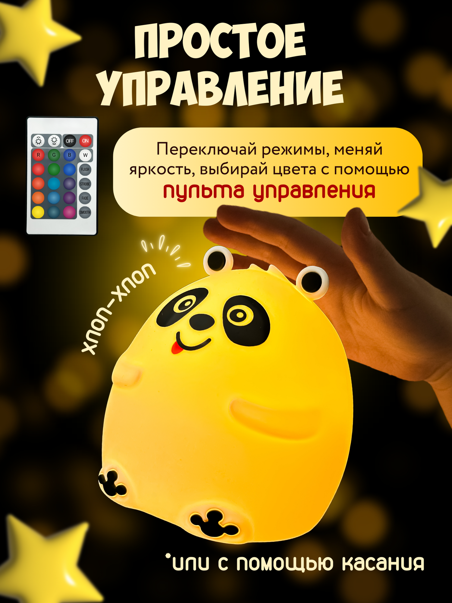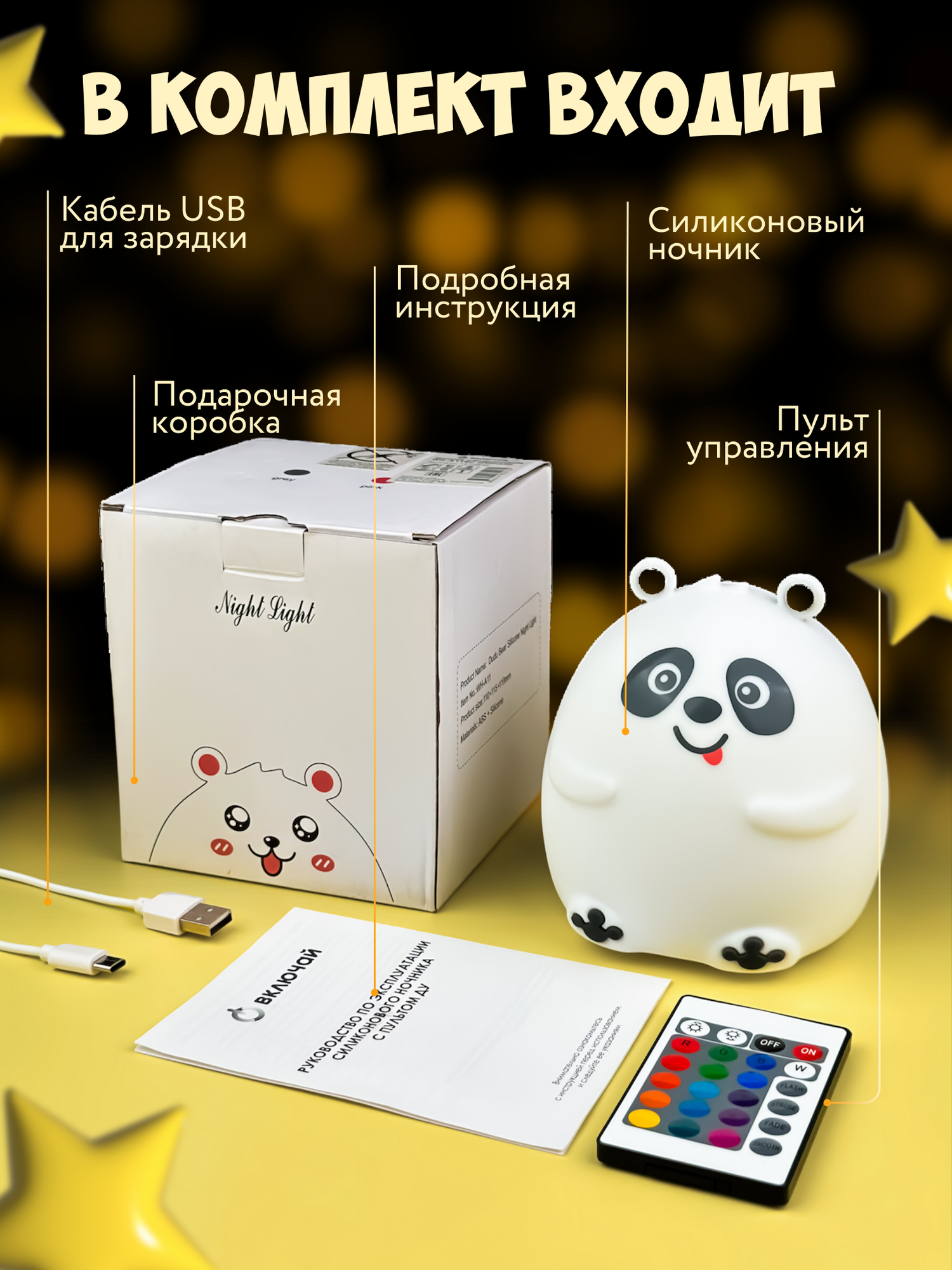 Ночник силиконовый WH-A11RC "Панда", USB, аккум. 1200мАч, 3000К+RGB (7 цветов), с ДУ Включай интересное: