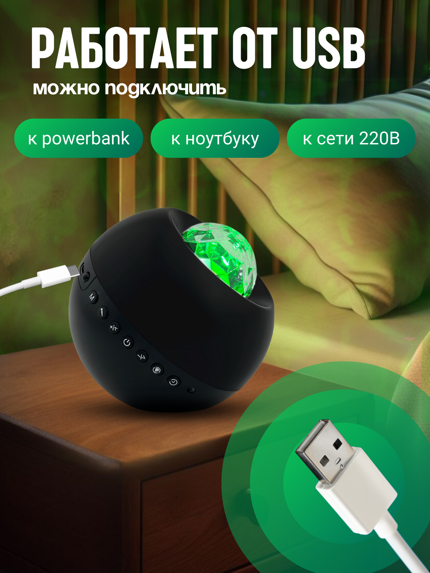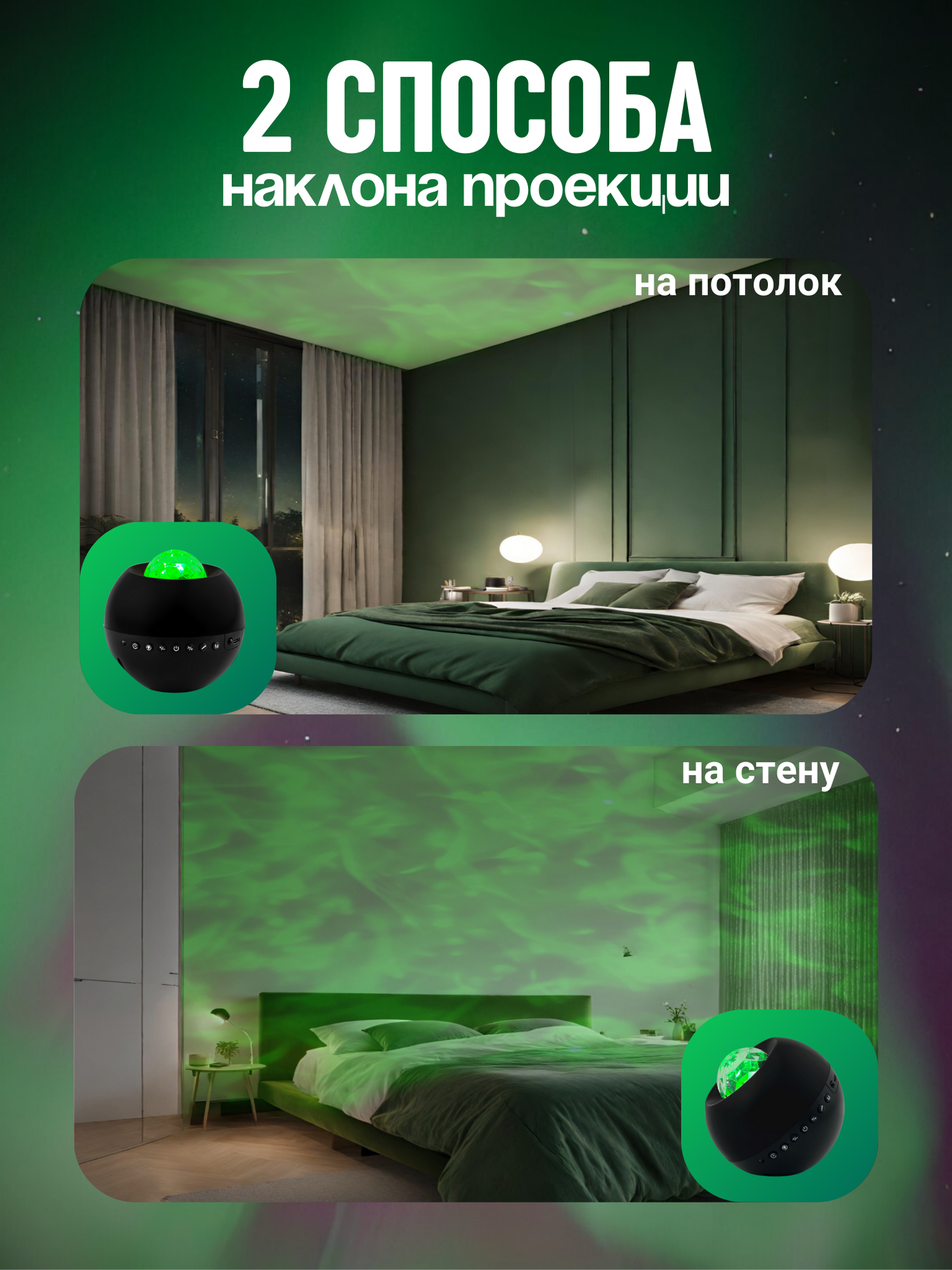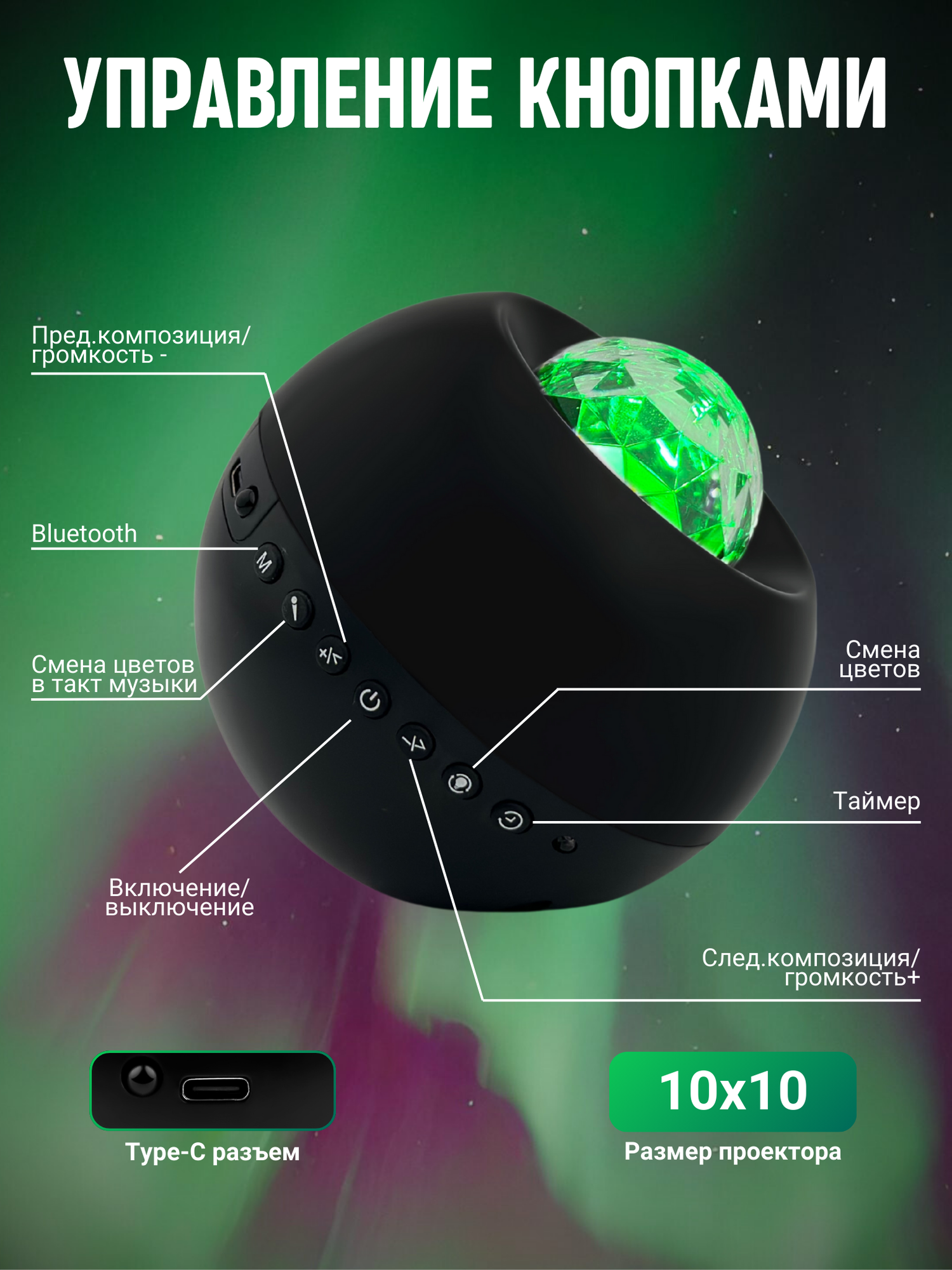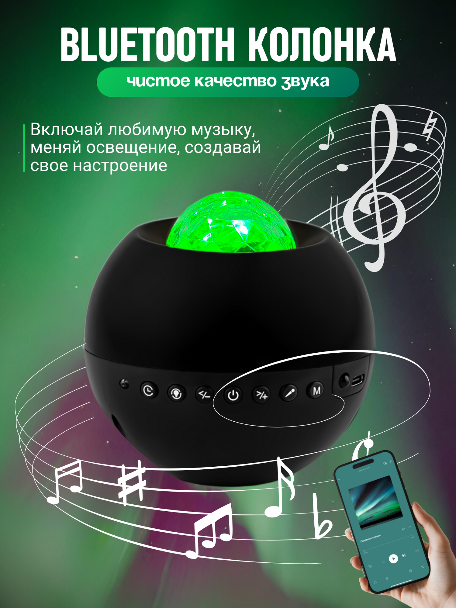 Ночник - проектор WH-E14 "Северное сияние" с Bluetooth, 9 цветовых проекций, 6 белых шумов, таймер, с ДУ Включай интересное: