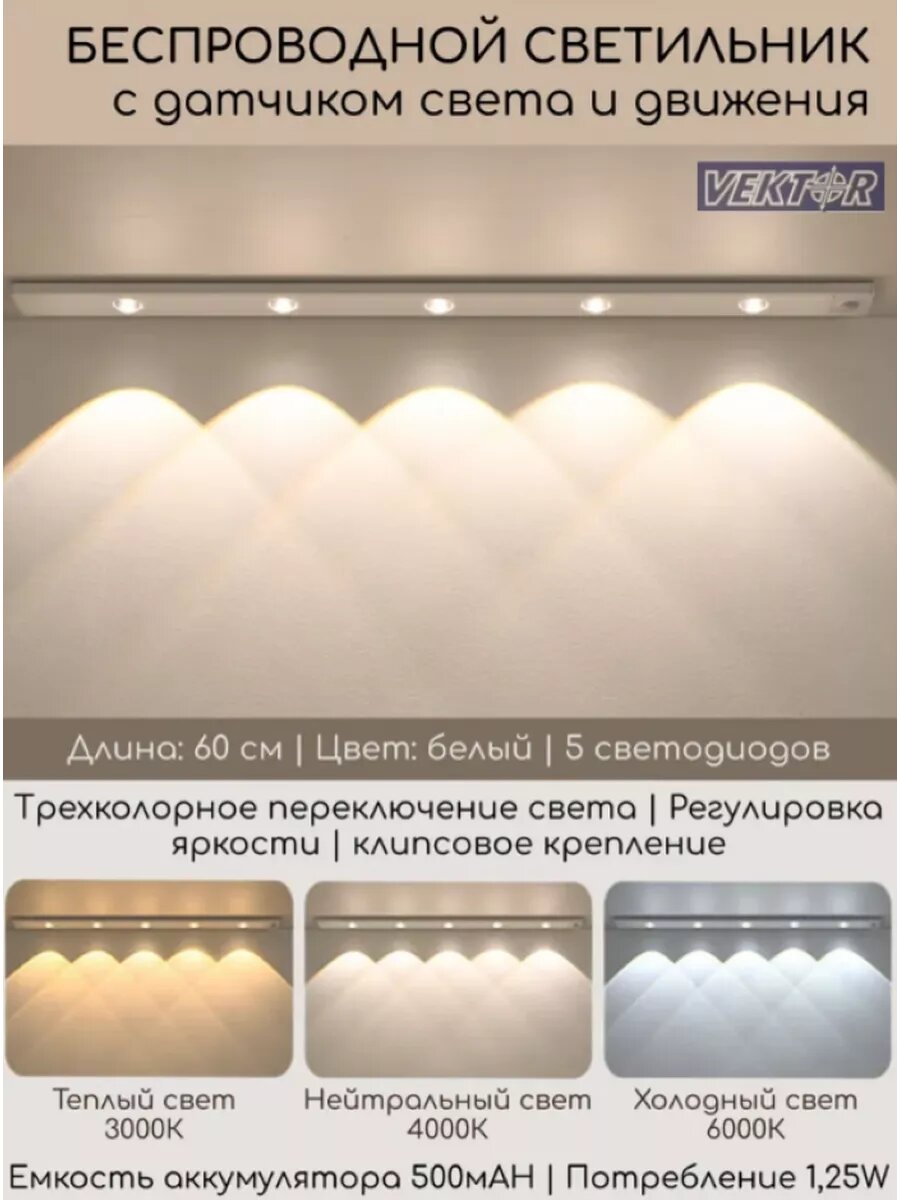 Беспроводной светильник с датчиком движения 60см белый. для кухни , в мебель , в прихожую . интересное: