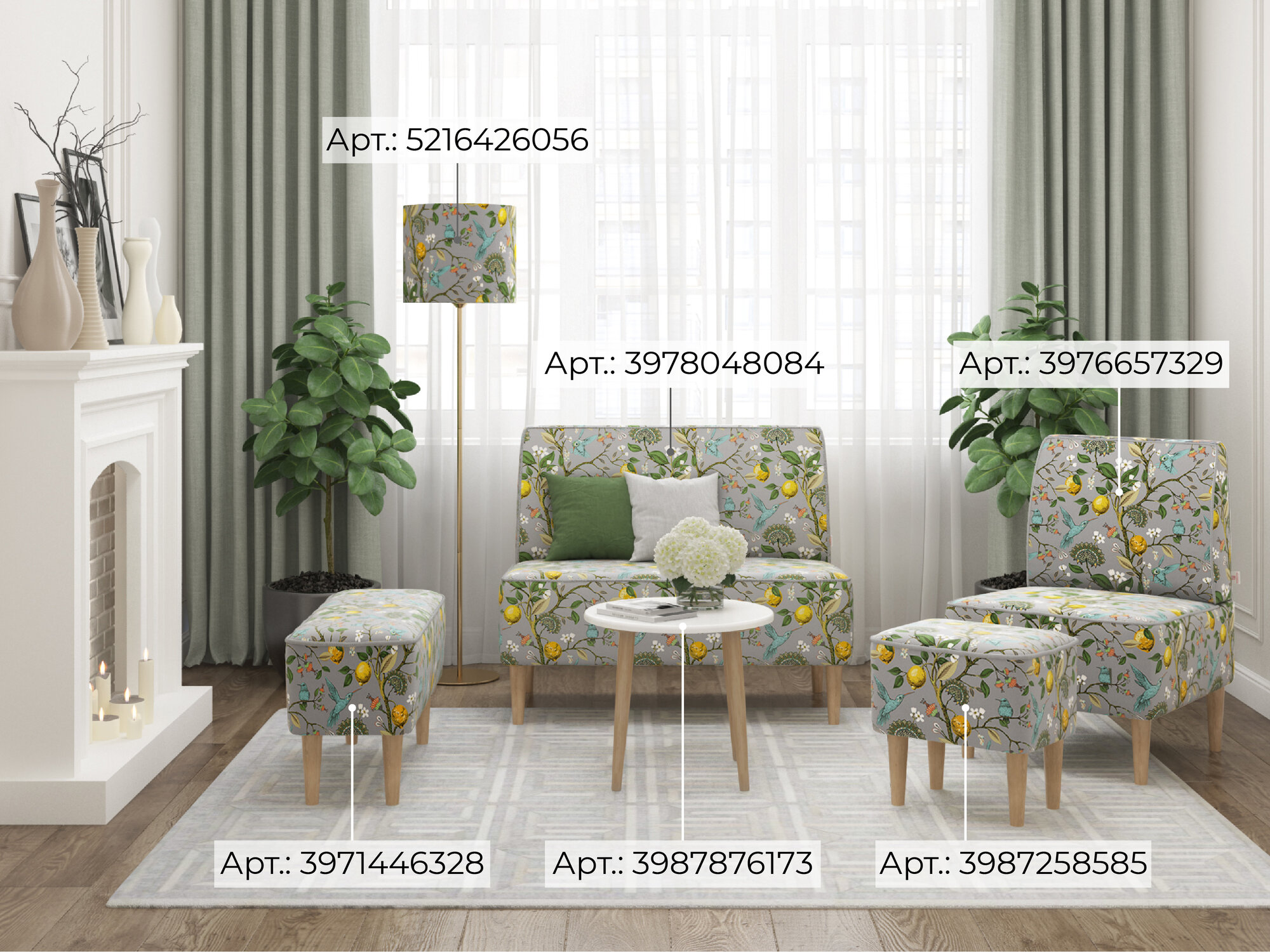 Торшер светильник напольный Лимоны серый с абажуром из велюра