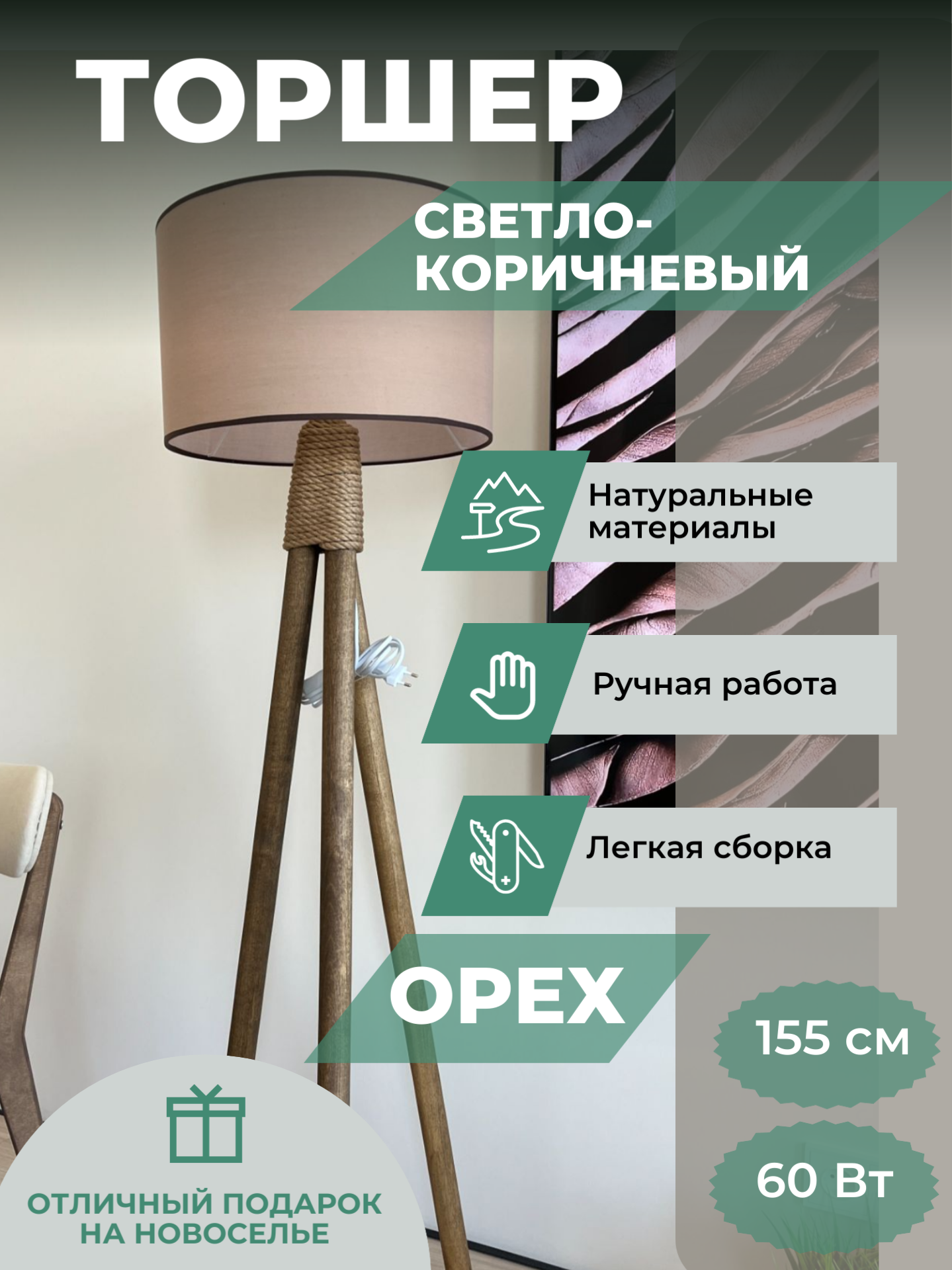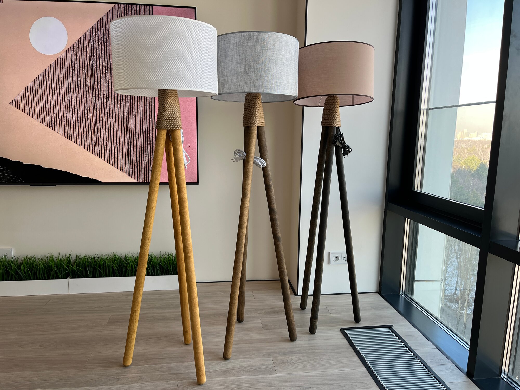 СохранитьТоршер напольный деревянный, цвет Орех, светло-коричневый абажур, стиль сканди, высота 155 см, ручная работа интересное: