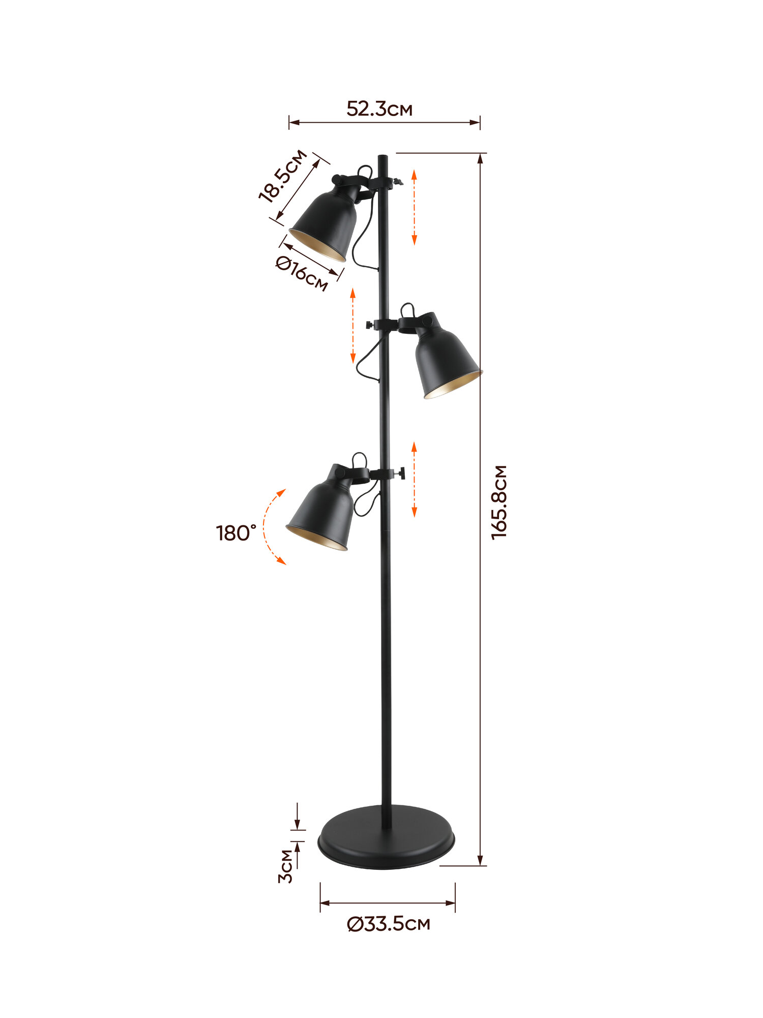 Купить Торшер напольный с тремя абажурами на регулируемой высоте. Светильник напольный с 3 лампами, Е27, металлический, черный.