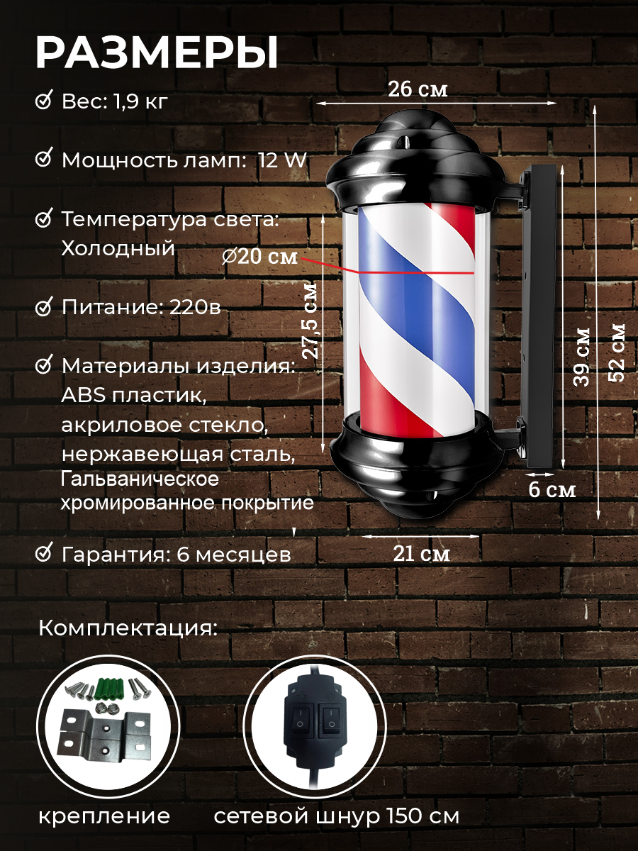 Барбер пол OKIRO Barber pole HC 71 / барберпул для барбер шопа / Barber pole Barber Shop уличный светильник