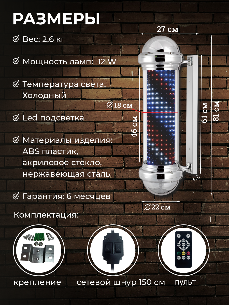 OKIRO / Барбер пол OKIRO Barber pole HD-75 / барберпул для барбер шопа / Barber pole Barber Shop уличный светильник